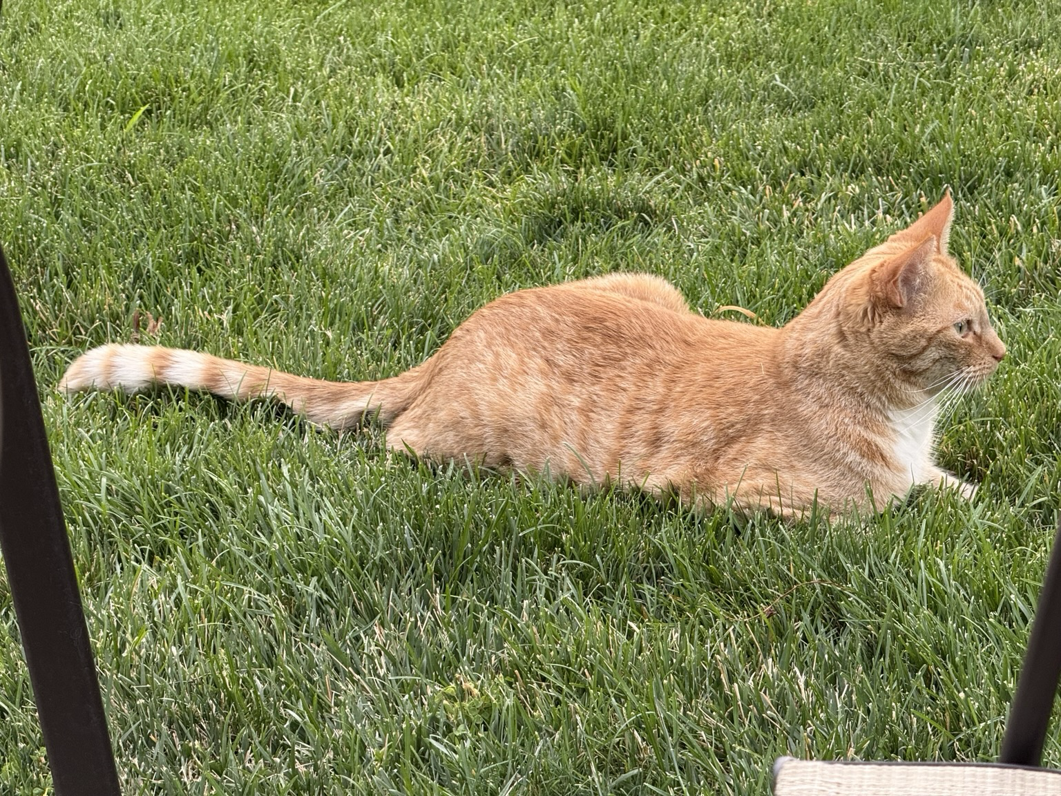 An orange kitty on green grass