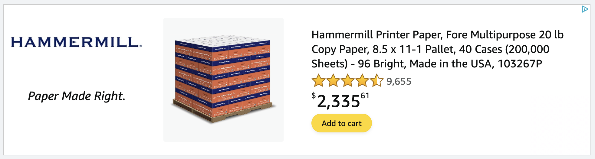 Advertisement for a giant pallet of printer paper on Amazon for $2,335