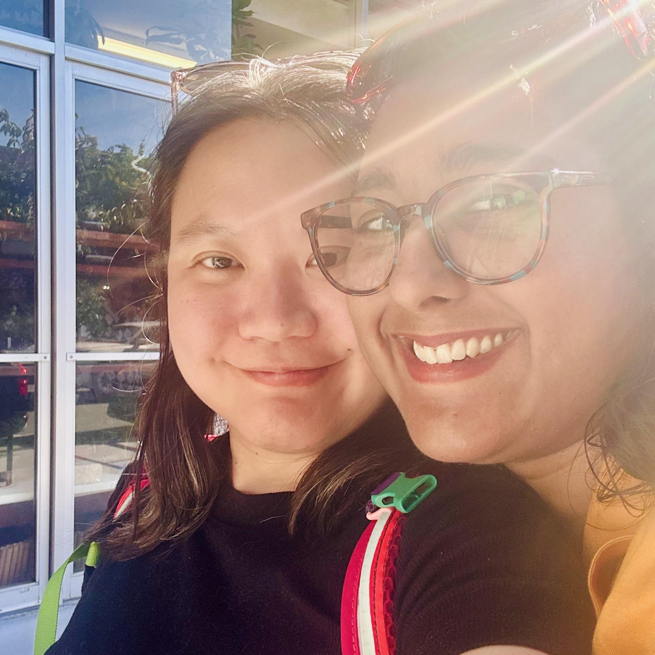 A selfie of two Asian women cuddling in the sunlight