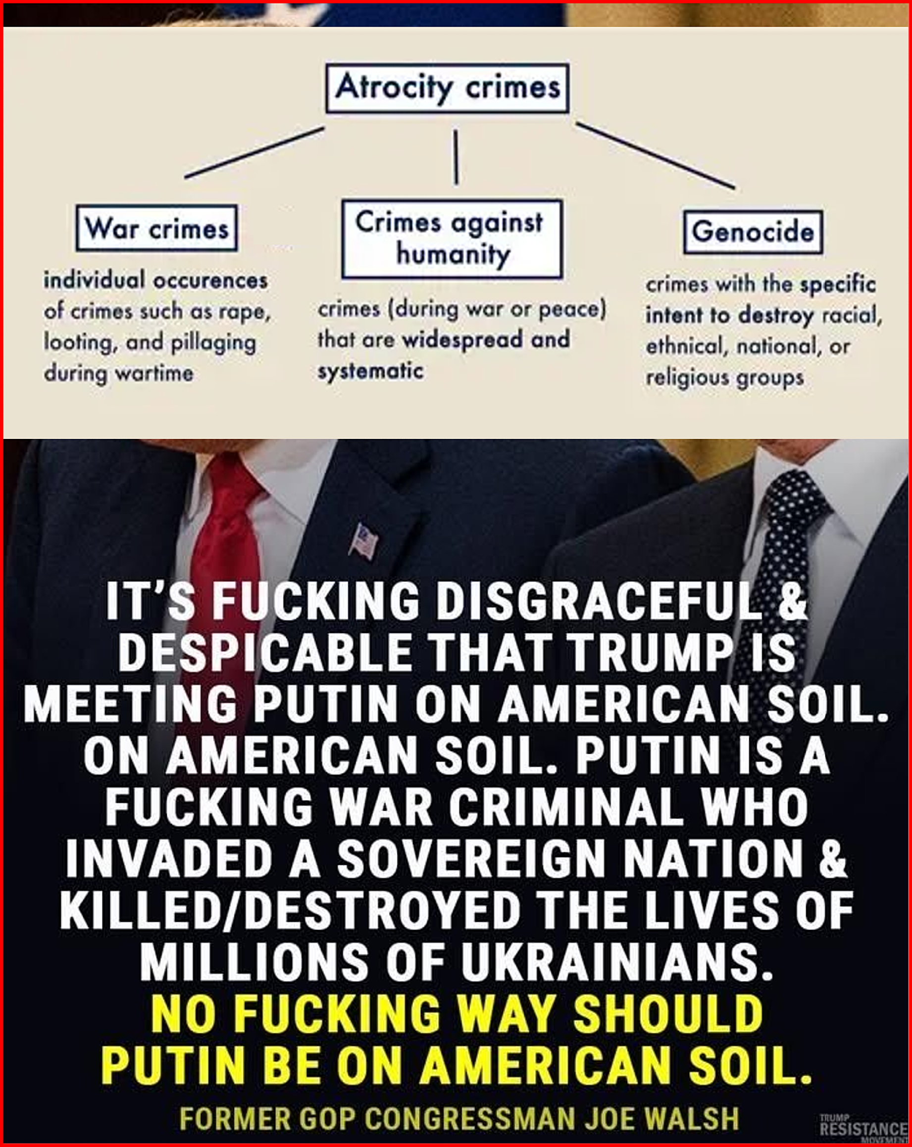 Putin is indiced in Intl Criminal Court for the Atrocity crimes War crimes, Crimes against, Genocide and Crimes against humanity IT'S FUCKING DISGRACEFUL & DESPICABLE THAT TRUMP IS MEETING PUTIN ON AMERICAN SOIL. ON AMERICAN SOIL. PUTIN IS A FUCKING WAR CRIMINAL WHO INVADED A SOVEREIGN NATION & KILLED/DESTROYED THE LIVES OF MILLIONS OF UKRAINIANS. NO FUCKING WAY SHOULD PUTIN BE ON AMERICAN SOIL. FORMER GOP CONGRESSMAN JOE WALSH #resist
