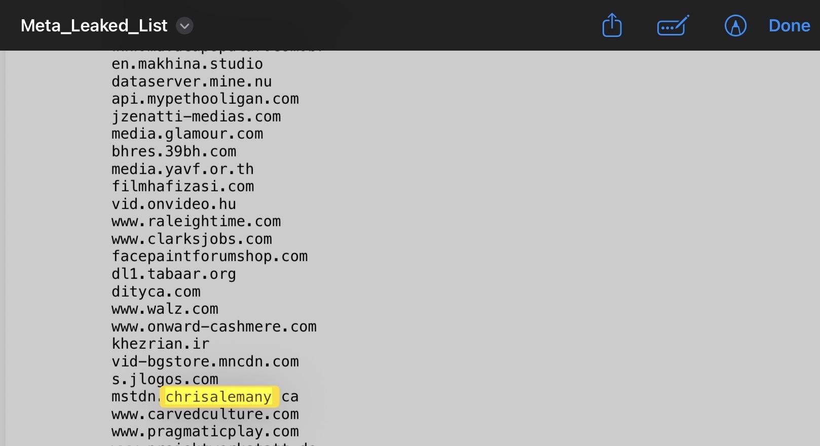 A list of domains in a document named meta leaked list shows my do,win highlighted.