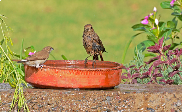 Kaksi lintua metallisen juomavesiastian päällä joka on laitettu kivirakennelman päälle. Joitakin kasveja ympärillä.