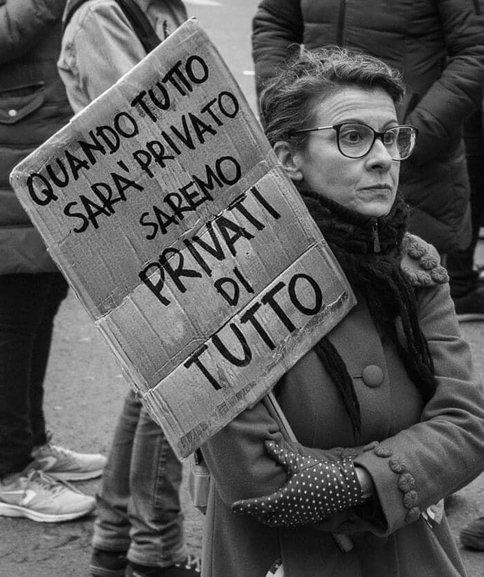 Foto in bianco e nero di una donna con in mano un cartello di cartone con su scritto "QUANDO TUTTO SARΓ PRIVATO SAREMO PRIVATI DI TUTTO"