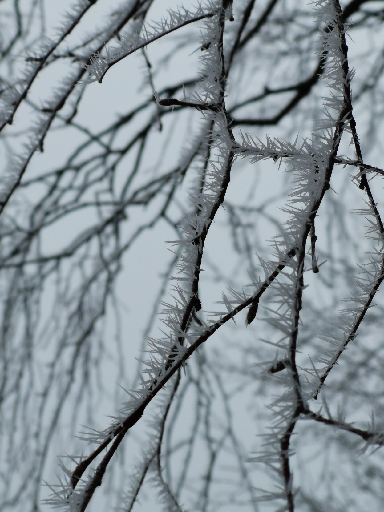 Piikikkääksi jäätyneitä koivunoksia meren rannalla