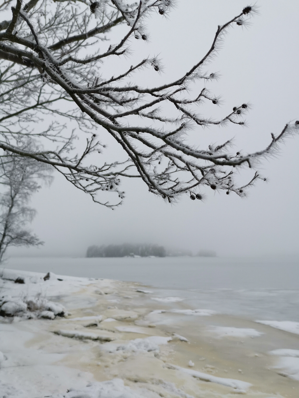 Näkymä jäätyneelle merelle jäätyneiden oksien alta