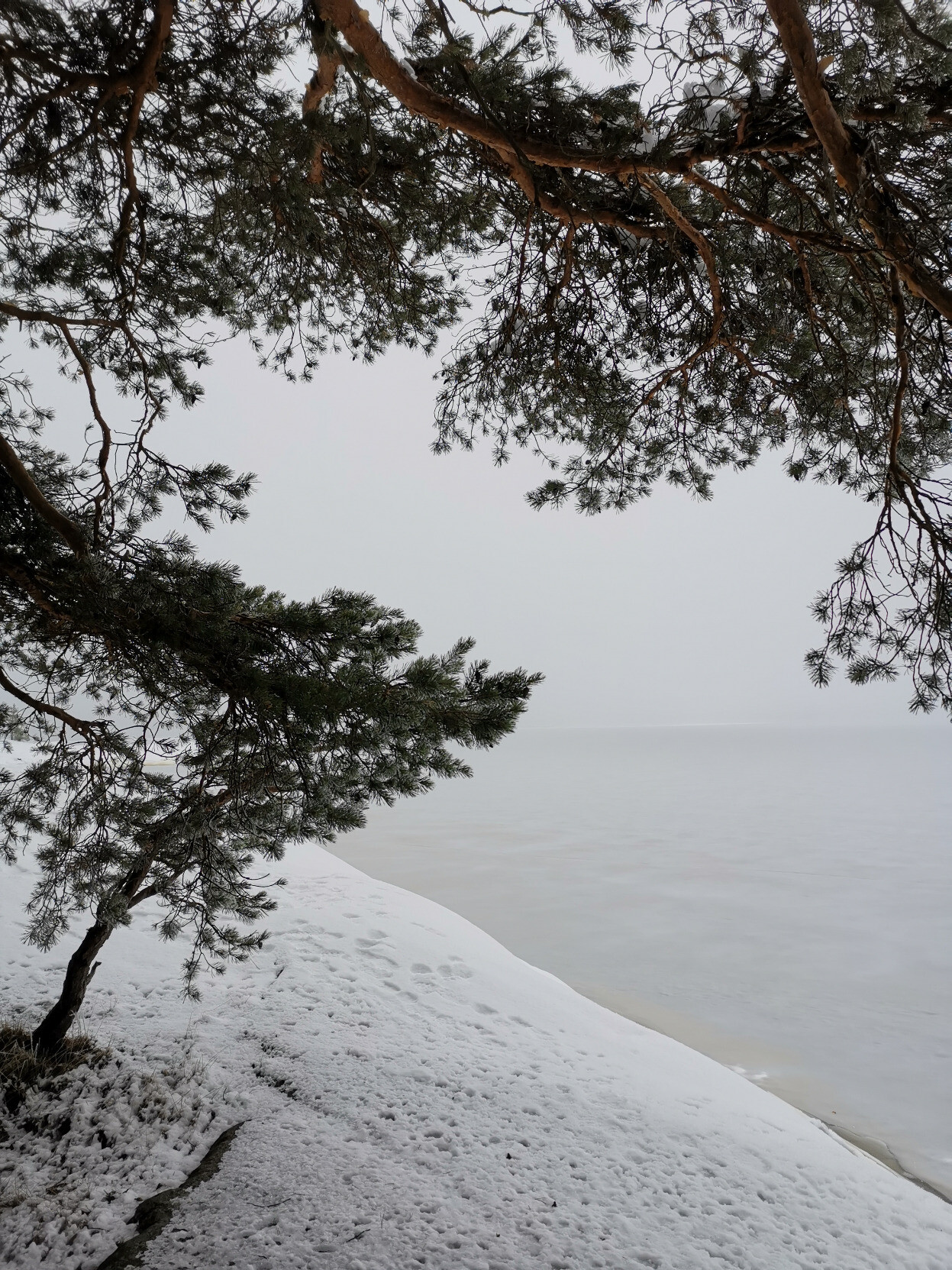 Kalliorinne ja sumuinen merinäkymä männynoksien lomasta