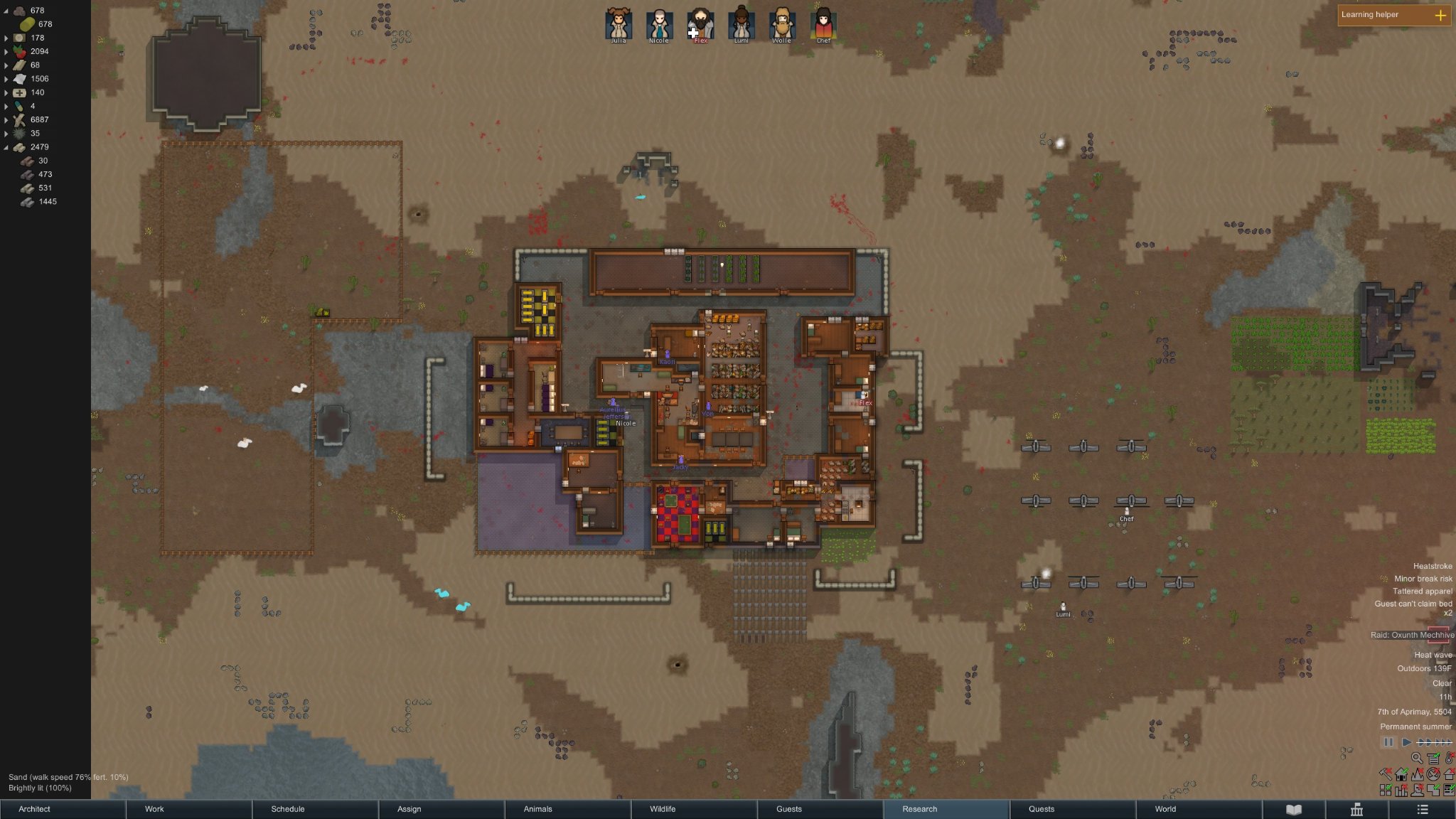 a very zoomed out rimworld screenshot showing a series of complexes vaguely forming a ring around a center complex. there is a wind farm and regular farms to the east, and animal pens to the west. the complexes are surrounded by fortifications