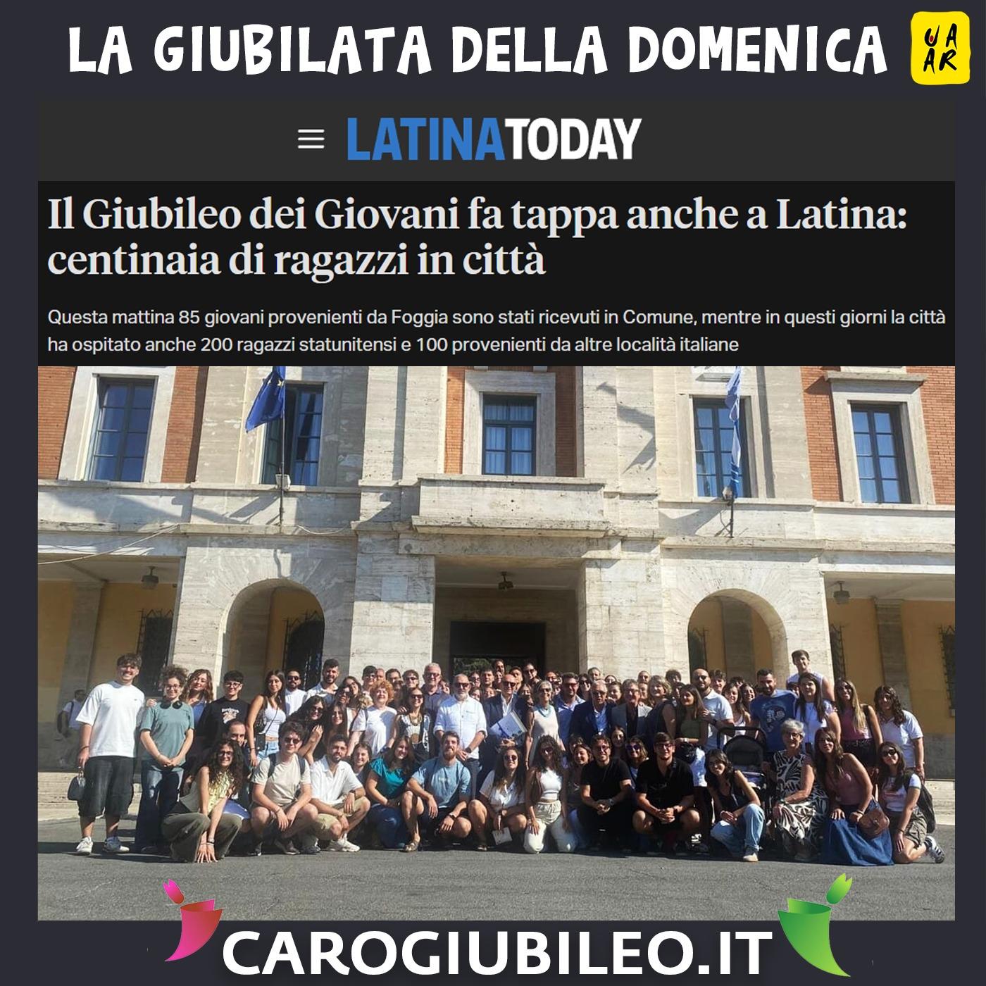 La giubilata della domenica. Sito: Latina Today Titolo: Il Giubileo dei Giovani fa tappa anche a Latina: centinaia di ragazzi in cittร . Sottotitolo: Questa mattina 85 giovani provenienti da Foggia sono stati ricevuti in Comune, mentre in questi giorni la cittร ha ospitato anche 200 ragazzi statunitensi e 100 provenienti da altre localitร italiane. Foto di un gruppo di giovani pellegrini del giubileo davanti al Comune di Latina. Www.carogiubileo.it