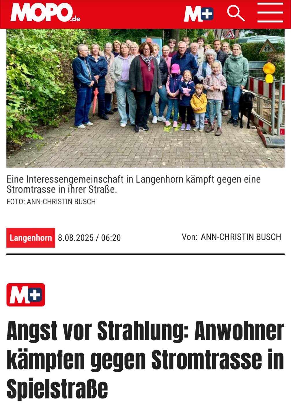 Mopo Schlagzeile zu einem Artikel mit dem Titel "Angst vor Strahlung - Anwohner kรคmpfen gegen Stromtrasse in Spielstraรe".