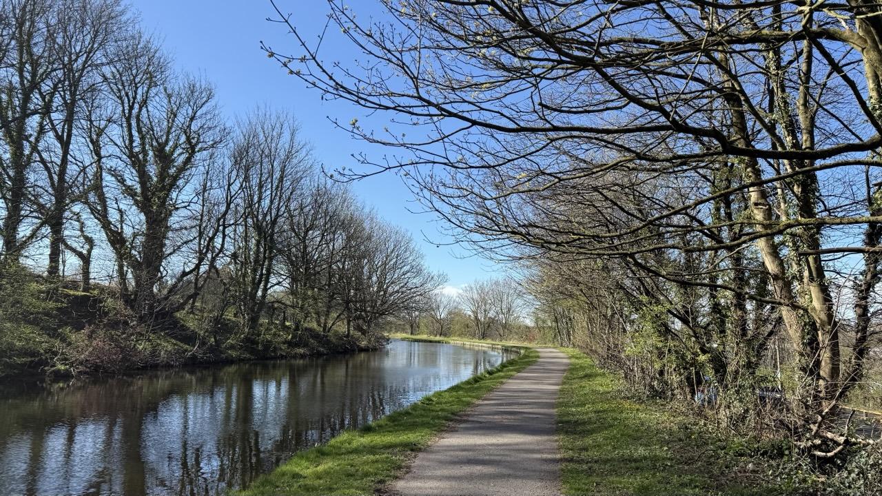 A walkway leads alongside an aqueduct. The sky is blue and the trees branches are still bare in this scene from early spring