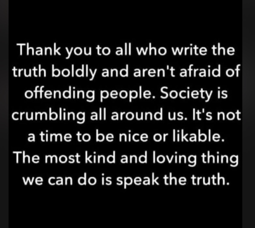 Thank you to all who write the truth boldly and aren't afraid of offending people. Society is crumbling all around us. It's not a time to be nice or likable. The most kind and loving thing we can do is speak the truth.