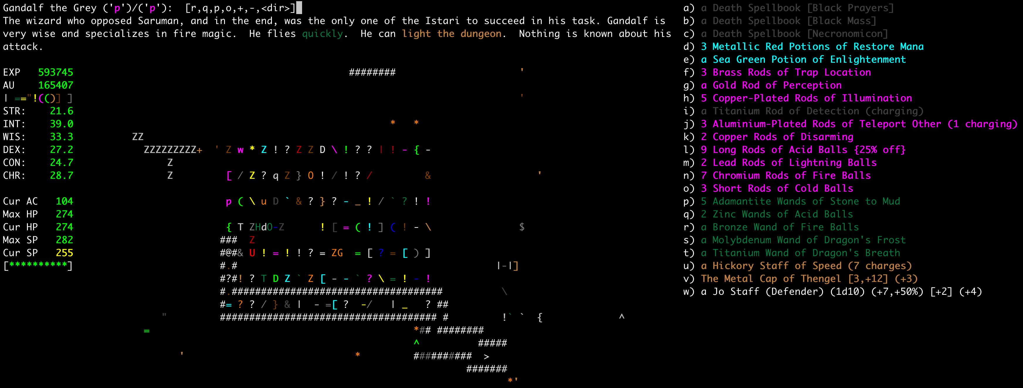 Screenshot of a Zangband game in progress. I found the Gandalf friendly NPC.