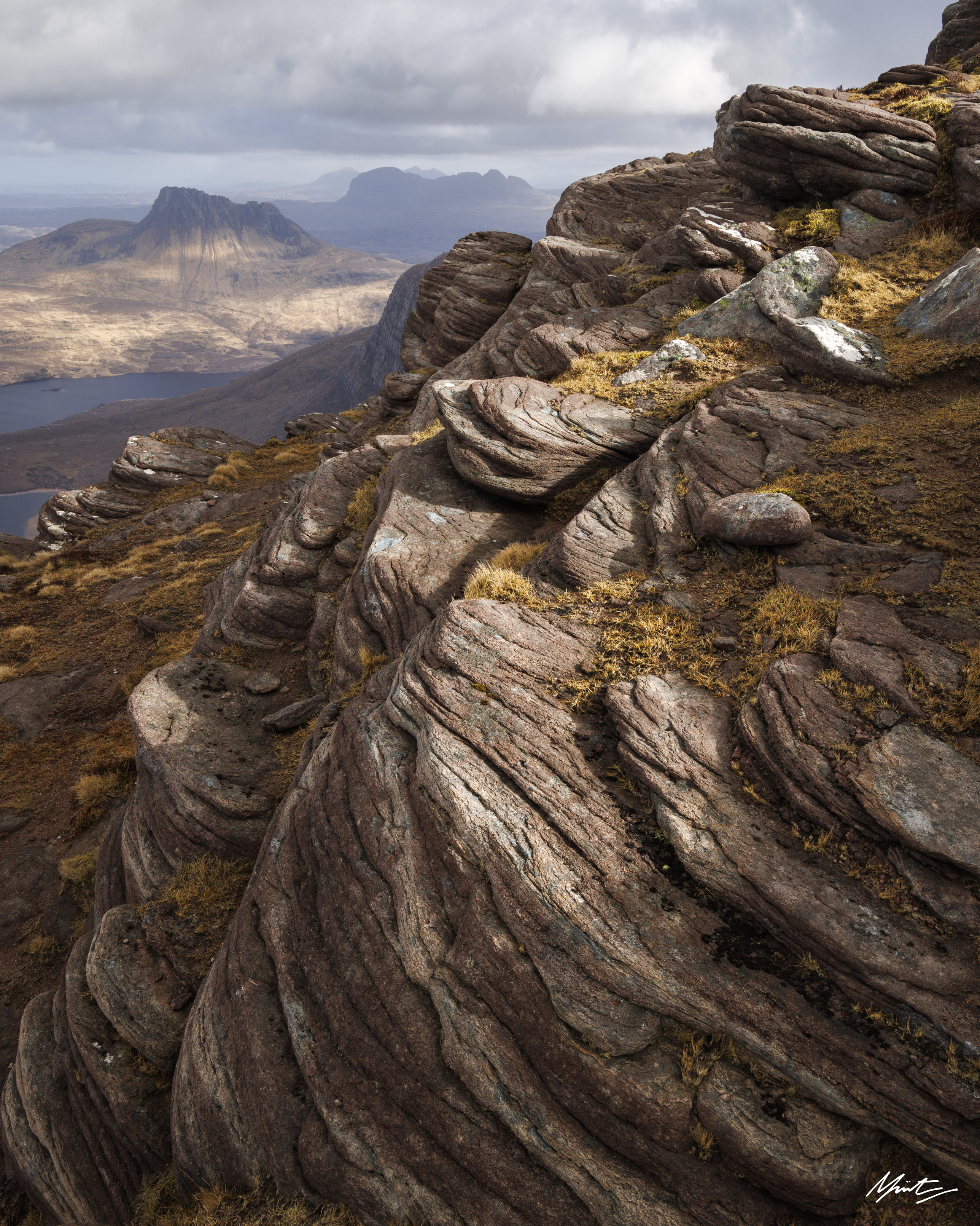 dappled light over the scottish moors with torridonian sandstone in the foreground