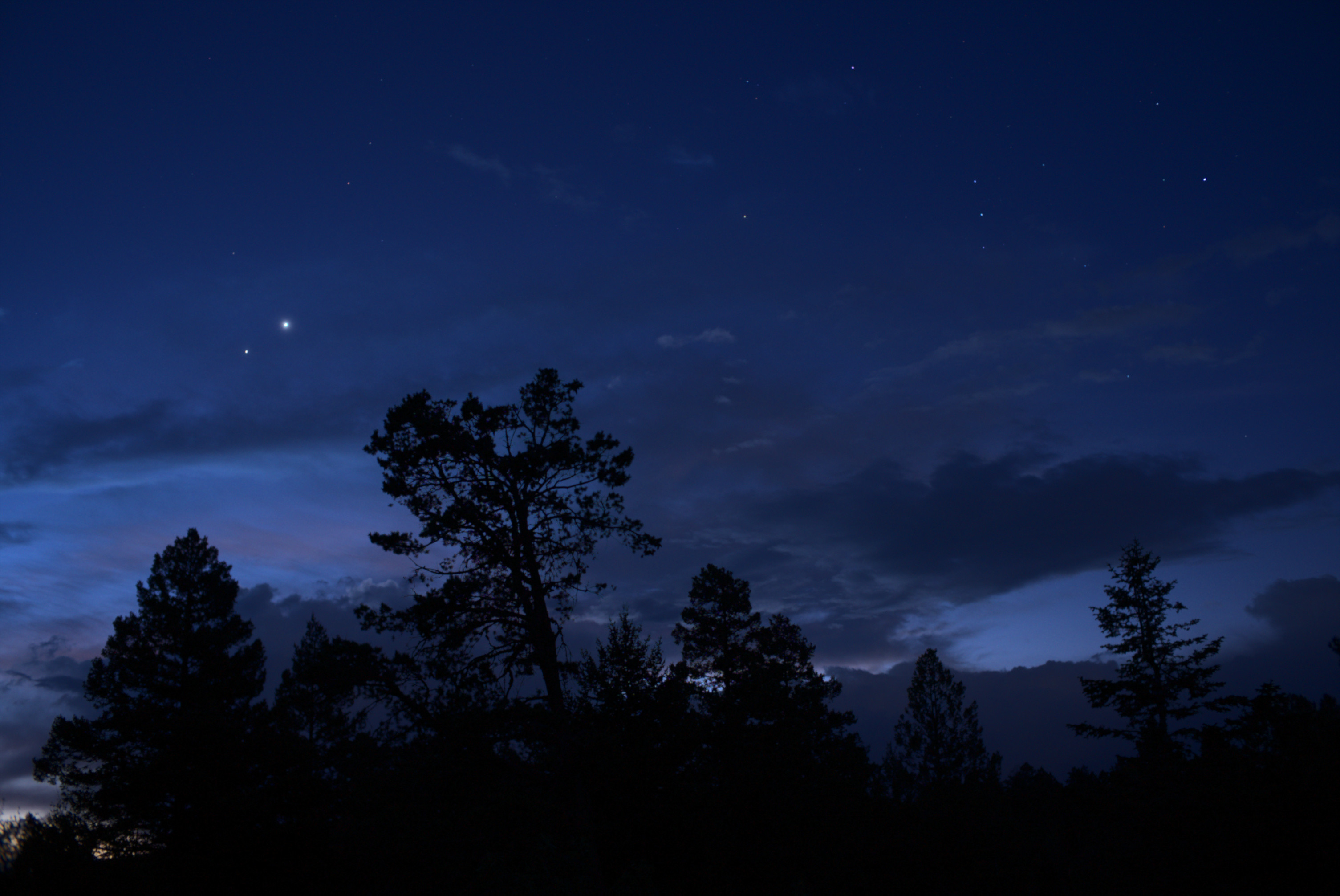 Jupiter and Venus shine brightly as the get closer to each other in the pre-dawn sky. Orion is in the right half of the frame. Trees are dark silhouettes. Scattered clouds add texture to the sky.