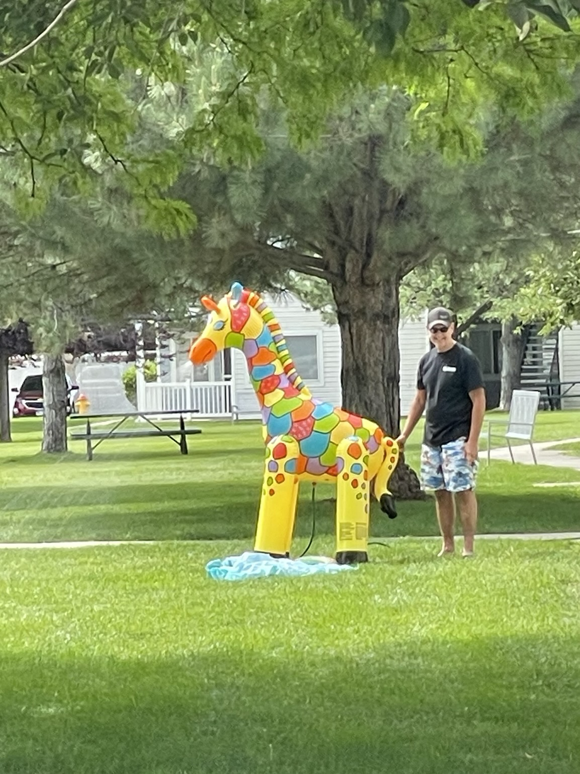 A colorful inflated unicorn squirts water out of its nose.