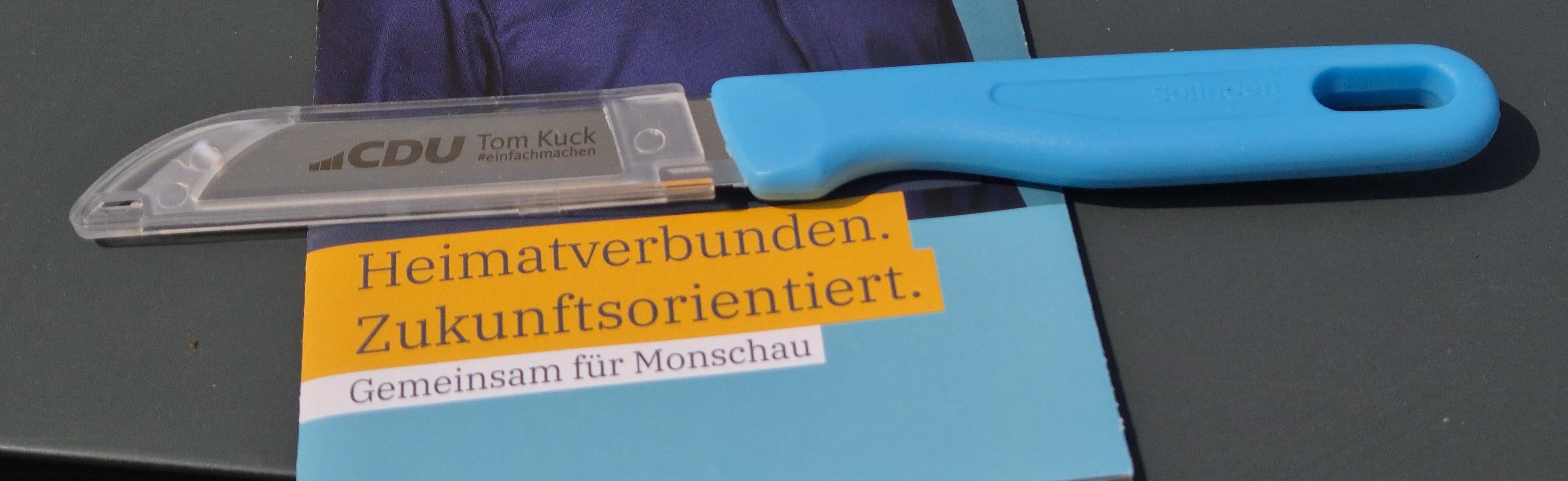 Foto eines hellblauen Messers auf einem Wahl-Pamphlet der CDU