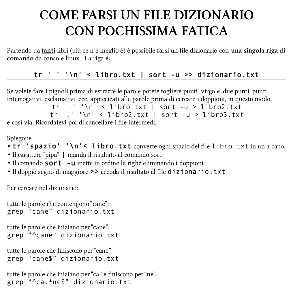 COME FARSI UN FILE DIZIONARIO CON POCHISSIMA FATICA Partendo da tanti libri (più ce n’è meglio è) è possibile farsi un file dizionario con una singola riga di comando da console linux. La riga è: tr ' ' '\n' < libro.txt | sort -u >> dizionario.txt Se volete fare i pignoli prima di estrarre le parole potete togliere punti, virgole, due punti, punti interrogativi, esclamativi, ecc. appiccicati alle parole prima di cercare i doppioni, in questo modo: tr '.' '\n' < libro.txt | sort -u > libro2.txt tr ',' '\n' < libro2.txt | sort -u > libro3.txt e così via. Ricordatevi poi di cancellare i file intermedi. Spiegone. tr ‘spazio’ ‘\n’< libro.txt converte ogni spazio del file libro.txt in un a capo. Il carattere “pipa” | manda il risultato al comando sort. Il comando sort -u mette in ordine le righe eliminando i doppioni. Il doppio segno di maggiore >> accoda il risultato al file dizionario.txt Per cercare nel dizionario: tutte le parole che contengono “cane”: grep “cane” dizionario.txt tutte le parole che iniziano per “cane”: grep “^cane” dizionario.txt tutte le parole che finiscono per “cane”: grep “cane$” dizionario.txt tutte le parole che iniziano per “ca” e finiscono per “ne”: grep “^ca.*ne$” dizionario.txt