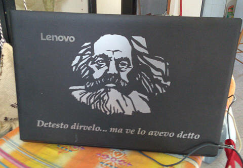 Computer portatile con ritratto di Marx e scritta "Detesto dirveloโฆ ma ve lo avevo detto"