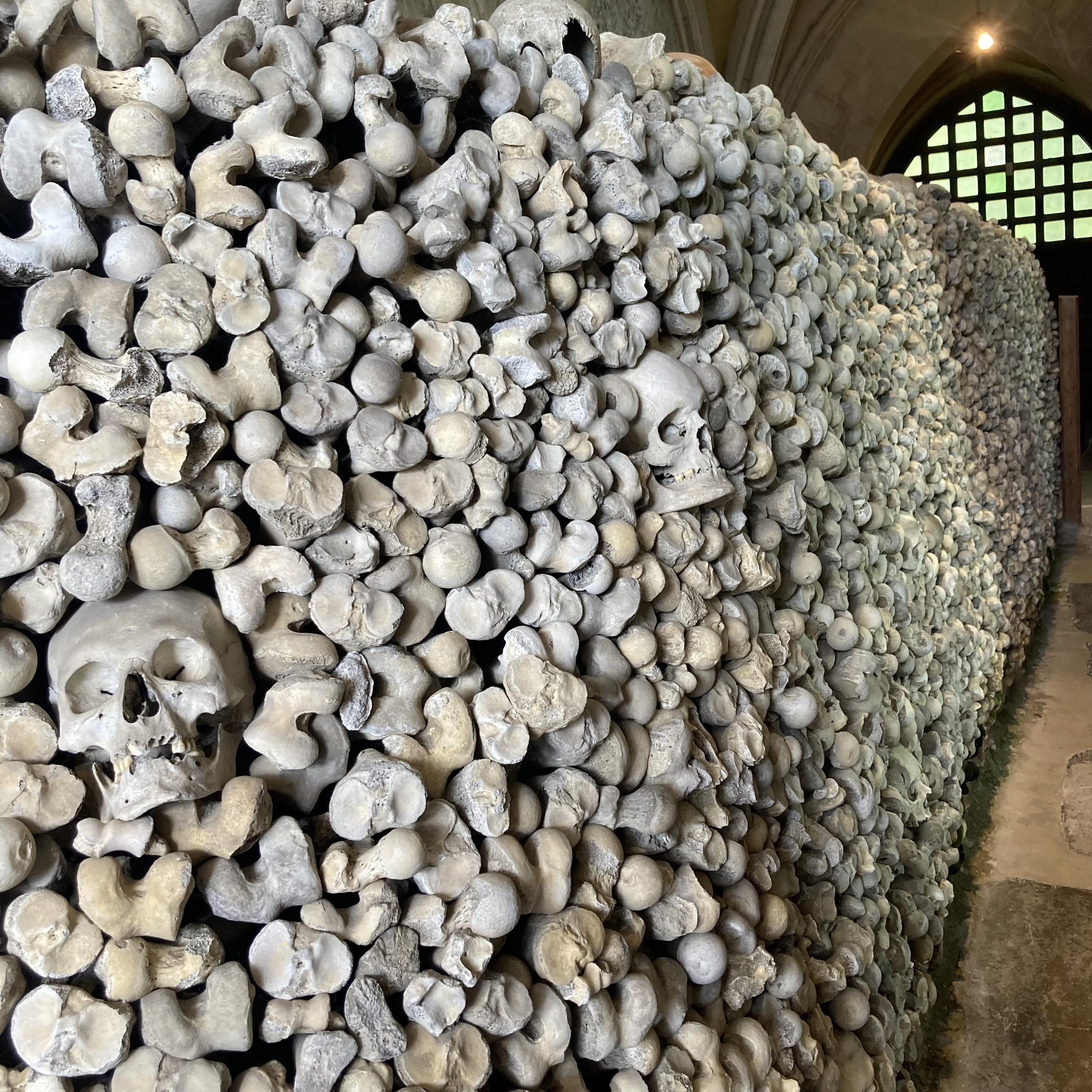 A stack of thousands of limb bones, about 6ft high stretching all the way down the side of a crypt from front to back. There is the odd skull with the stack. At the back of the crypt there is a triangular window high up with a grid of iron across it.