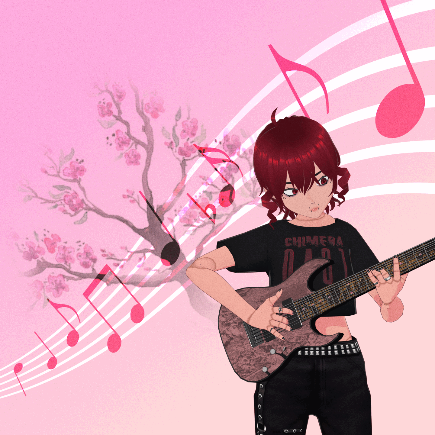 Teto plays her 8-string guitar in fingerstyle. Musical notes stream past her as a cherry tree fades into existence, visually depicting the pretty music she is playing.