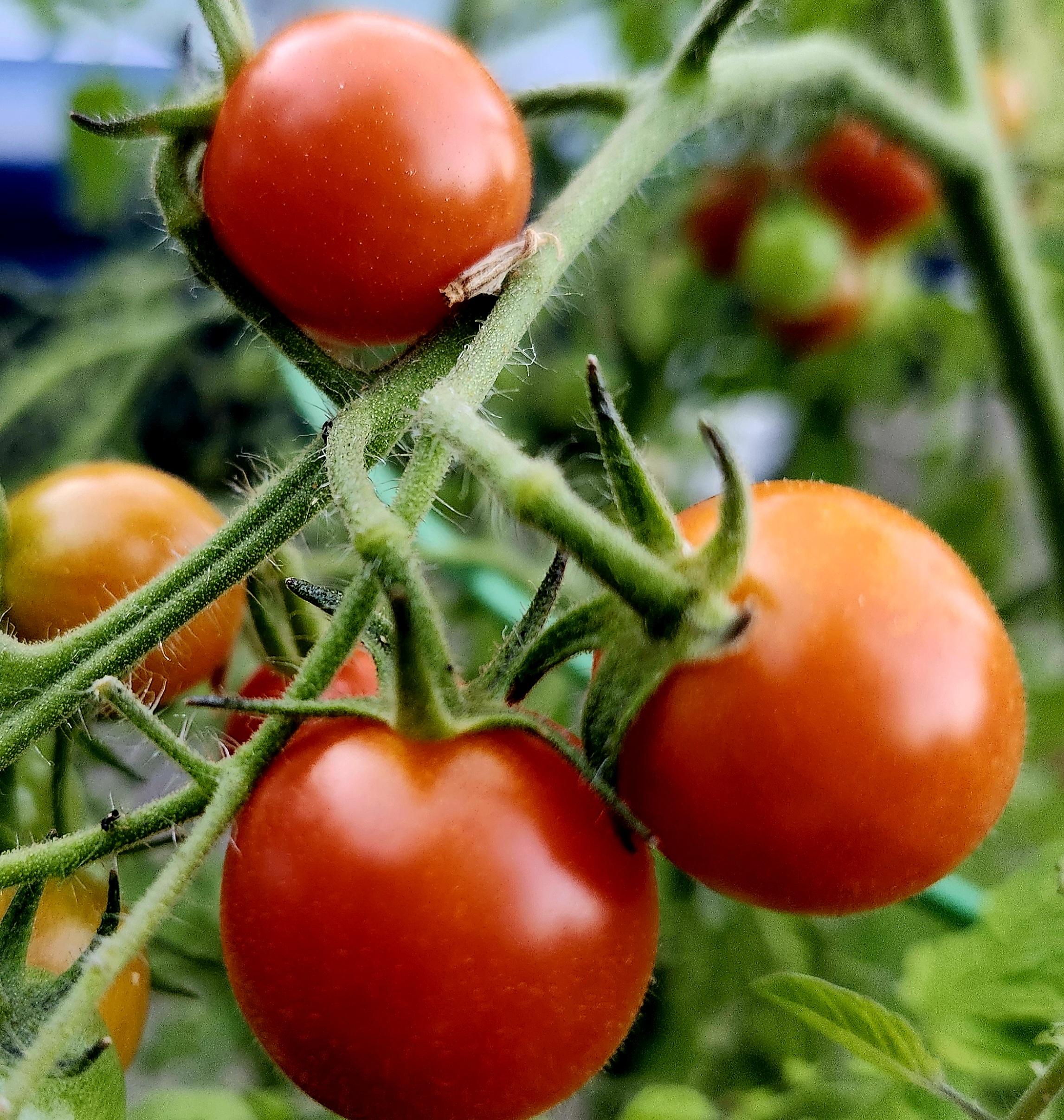 Closeup of cherry tomatoes on the vine, the shiny skin colors varying between red ripe and pale orange and green.