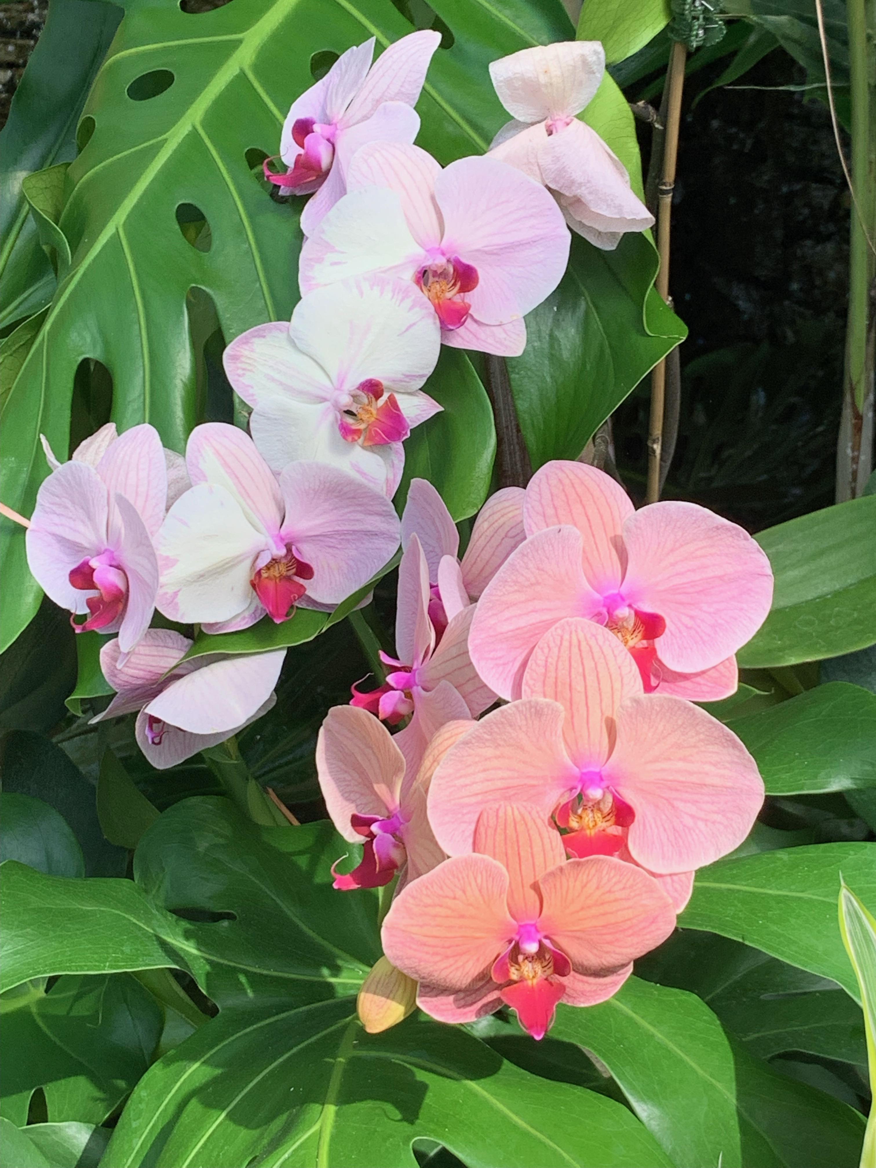More orchids from the botanical garden in Charlotte, NC. This photo shows 2 different flower spikes, each with a profusion of different-shaded pink flowers (at least 7 on each on.) As someone who has tried (and failed) to grow little ones garnered at a grocery store, seeing this was amazing.