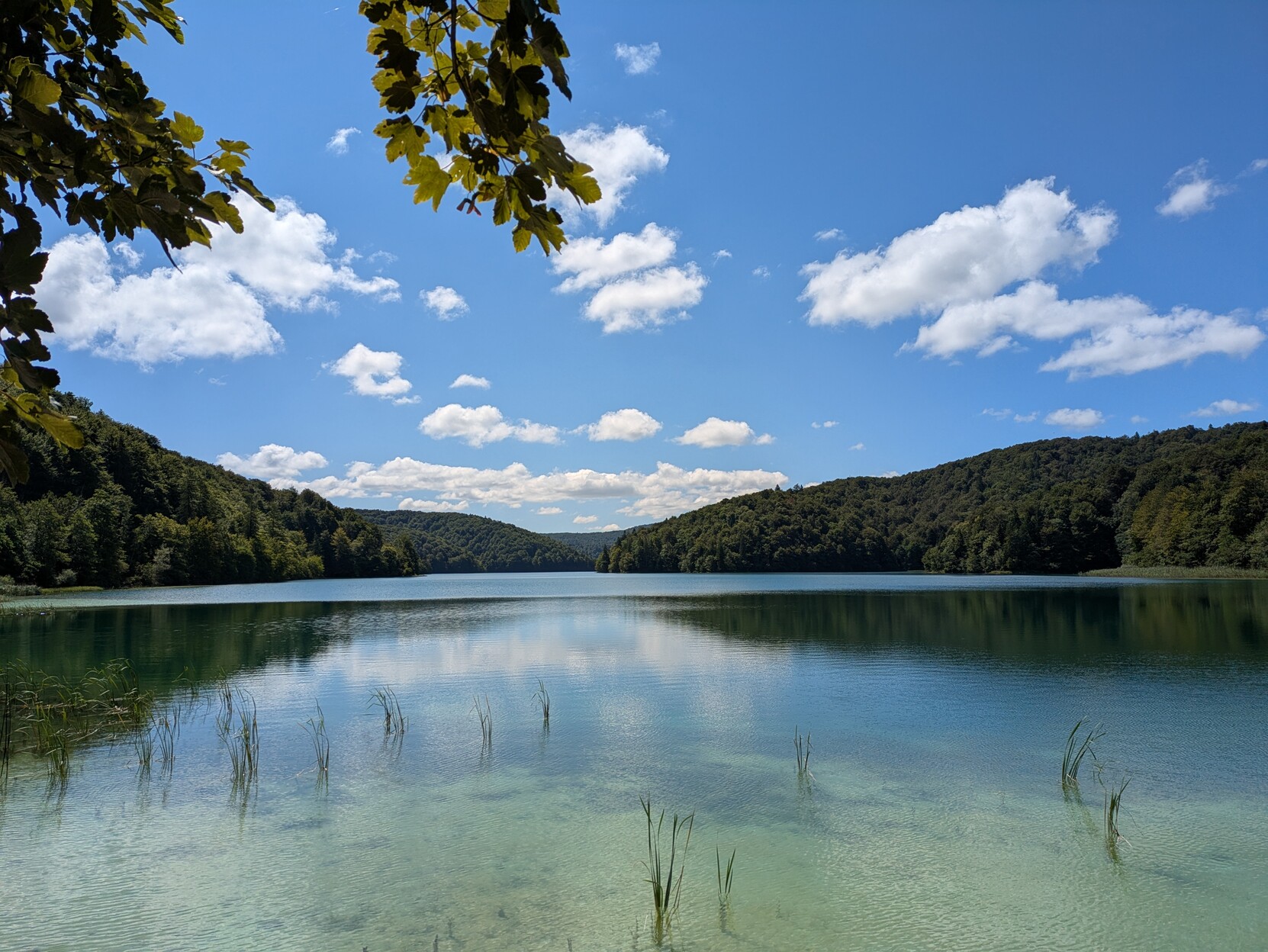 The upper lake of Plitvice national park in Croatia. The sky is a deep blue with puffy white clouds. The water of the lake is a deep blue and green color and mountains covered in green forests surround the lake. A few tree branches can be seen in the upper part of the picture.