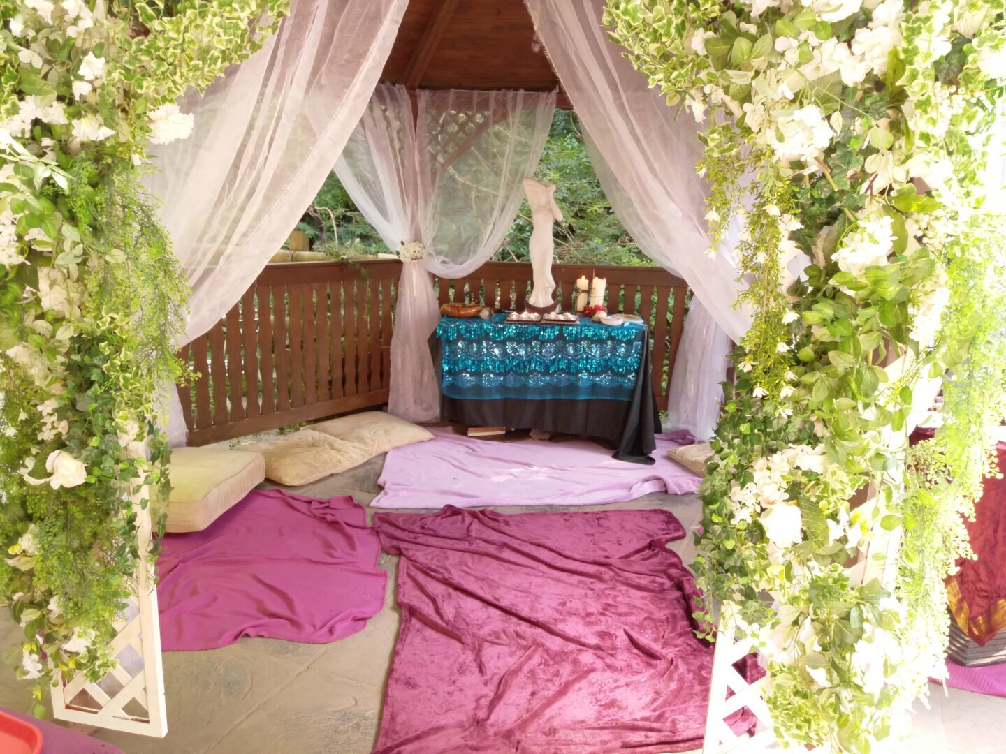 A picture of a pop up temple containing an altar, upon which sits a statue of a goddess among candles and crystals. upon the floor are red rugs, and the temple is draped in white gauze.
