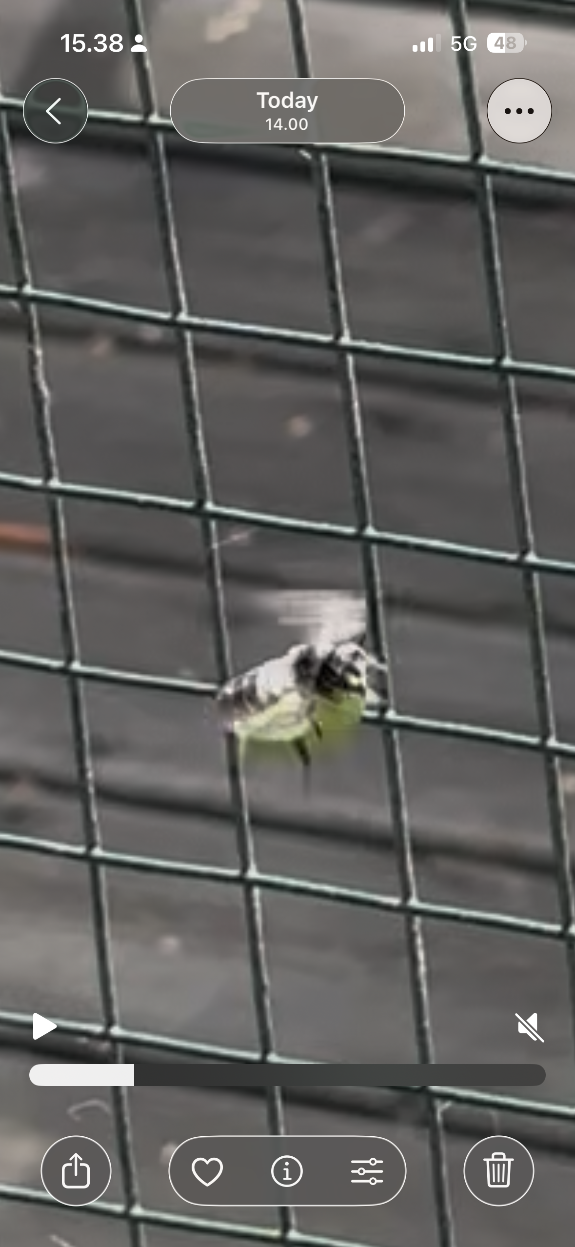 Ampiaisen näköinen pörriäinen lentää verkon läpi lehdenpalanen jaloissaan