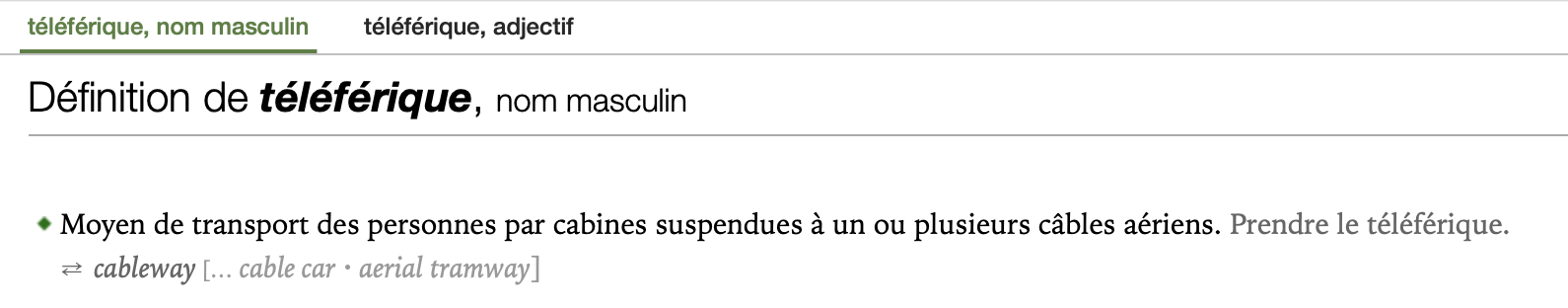 Screenshot from Antidote in French that reads: Definition of "téléférique" - Method of person transportation using suspended cabins by one or more aerial cables -> Cableway [… cable car, aerial tramway]