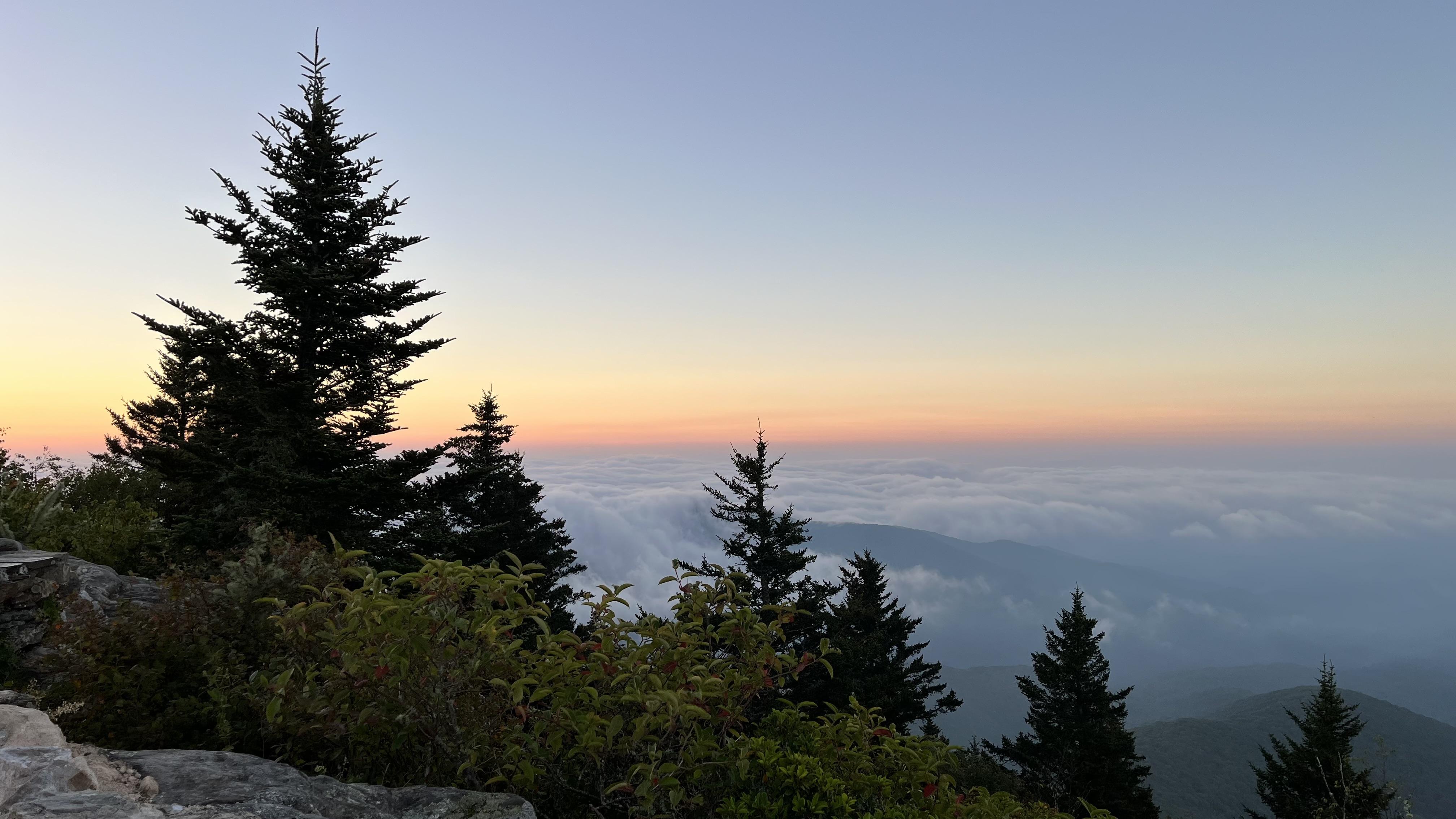 A view from the top of the Devil's Courthouse near Asheville, along the Blue Ridge Parkway in Asheville, NC from August 2023. We cannot currently get to this spot due to tremendous damage to the road (and doubtless the trails) due to Helen last September. This was about dawn that day, although the sun is actually coming up to my left behind the trees and outcropping. The outlook here is at 5720' and the sides down into the gully are home to nesting Pergrine Falcons, and tightly controlled to keep people out. The walk up is quite steep, although much of it is macadam. Some spruce trees line the view, and the valley is full of fog, while color begins in the distance, shading from red to orange to yellow to green and then blue. We were a few minutes later than I'd hoped, but still a gorgeous spot.