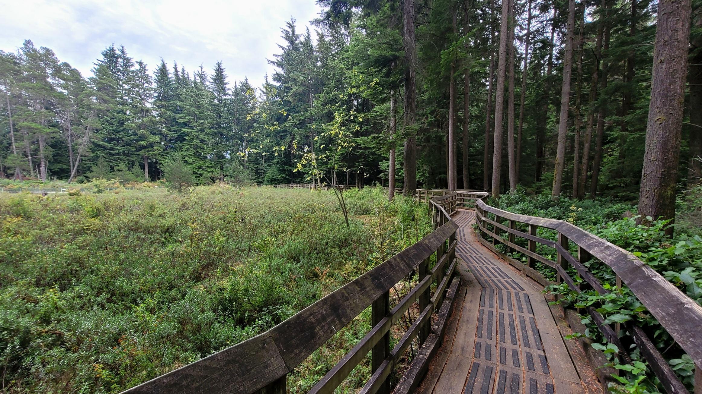 A lush bog on the left side, and a wooden walkway with railings on the right side of this scene. The coniferous forest wraps around the bog, starting from the right side.