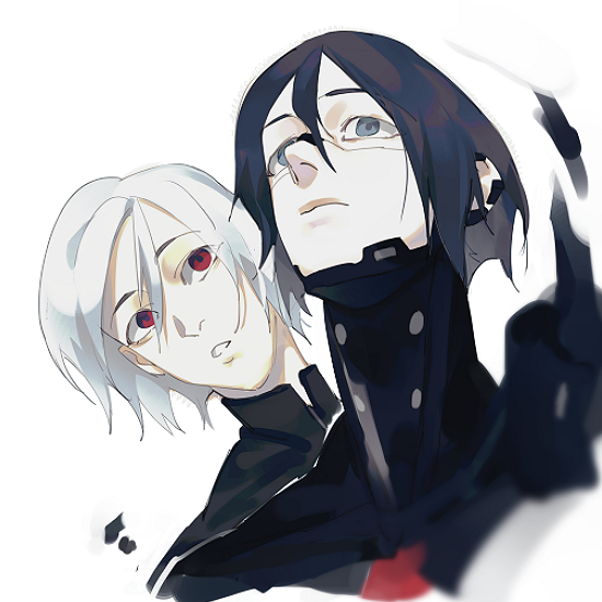 Danbooru tags: 2girls ariane_yeong black_hair cyberpunk elster_(signalis) joints metal_skin multiple_girls red_eyes robot_girl robot_joints short_hair signalis uchu_keito white_background white_hair yuri