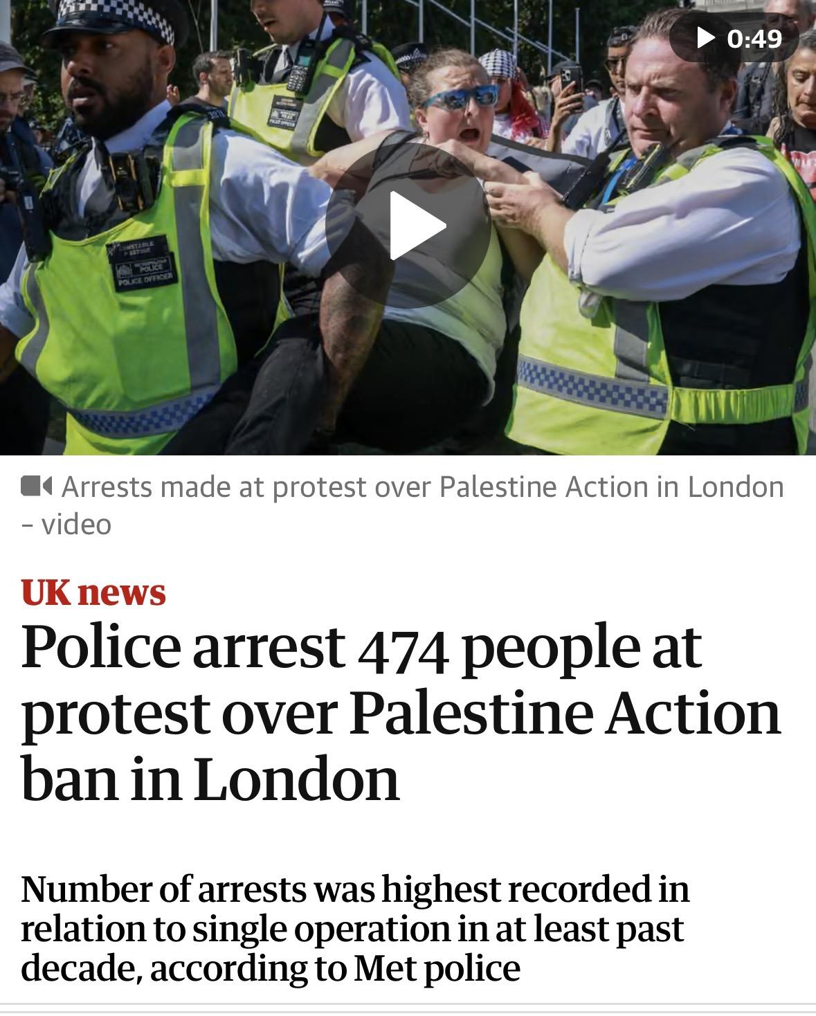 Screenshot of top of article 0:49 OLICE OFFICIES •‹ Arrests made at protest over Palestine Action in London - video UK news Police arrest 474 people at protest over Palestine Action ban in London Number of arrests was highest recorded in relation to single operation in at least past decade, according to Met police