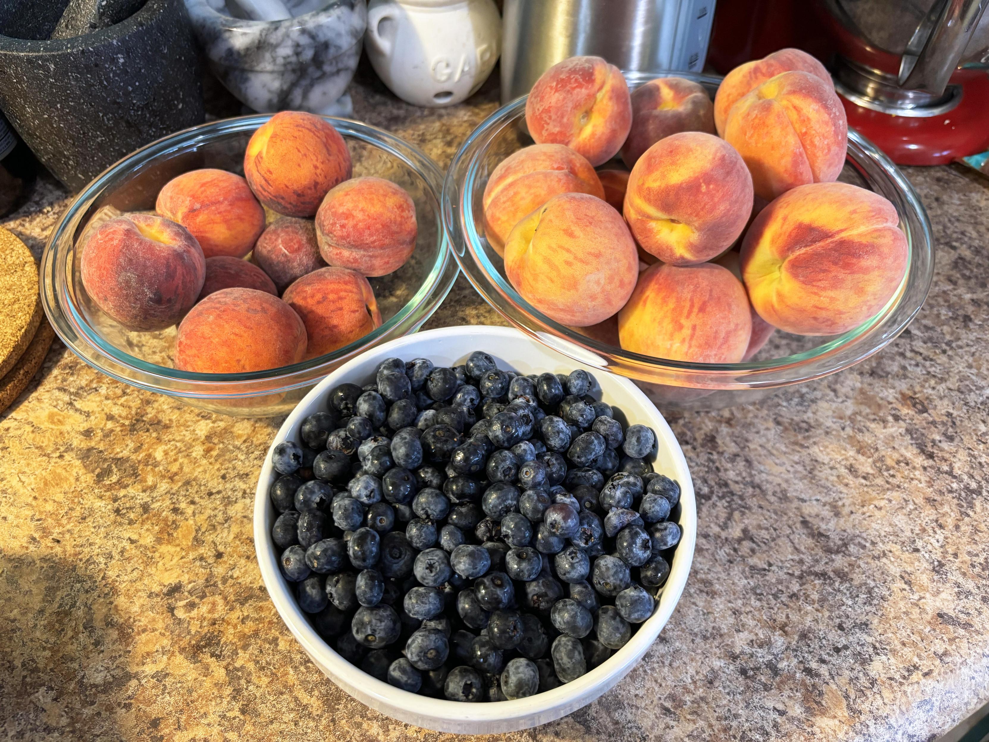 Bowls of Ontario Peaches and blueberries on my overcrowded counter.