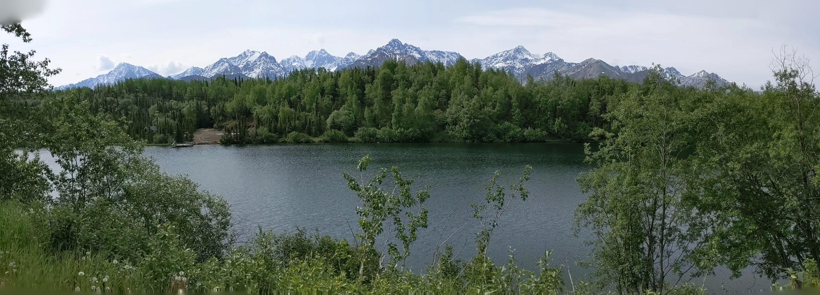 A lake surrounded by trees with a backdrop of large snow covered mountains in the distance