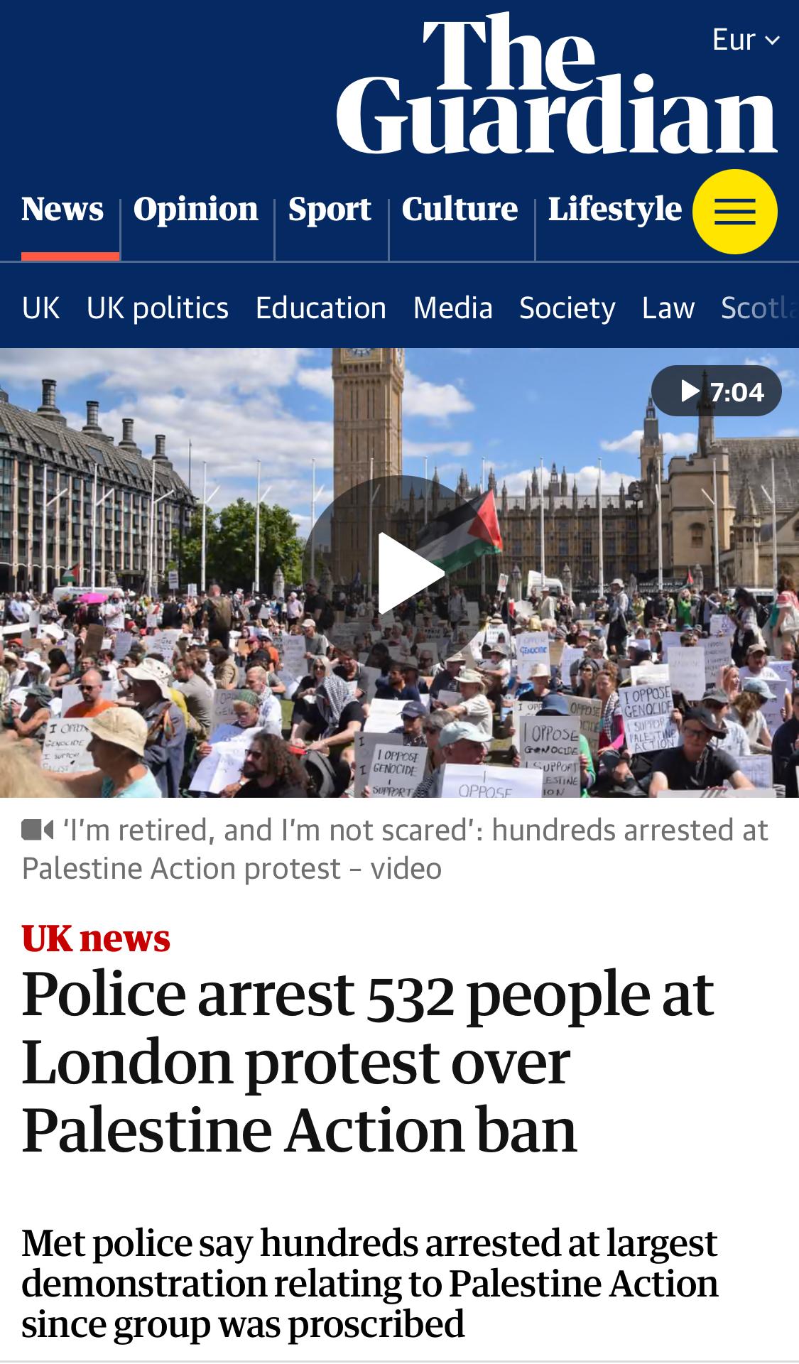 The Guardian: Police arrest 532 people at London protest over Palestine Action ban Met police say hundreds arrested at largest demonstration relating to Palestine Action since group was proscribed