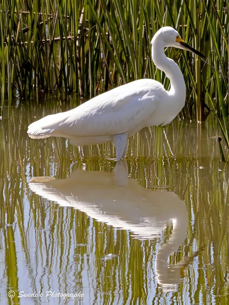 "A snowy egret stands motionless in a shallow marsh, its pure white plumage glowing softly against a tapestry of tall, green reeds. The marsh is quiet, its water still and dappled with earthy tones, cradling the egret like a mirror. Every detail of the bird—its slender neck, sharp yellow beak, and delicate black legs—is echoed in the glassy surface below, creating a perfect reflection that feels almost surreal. The reeds rise densely around the egret, their blades swaying gently in the breeze, forming a living curtain that frames the scene. Their vibrant green contrasts with the egret’s snowy feathers, emphasizing the bird’s elegance and isolation. Light filters through the marsh, casting a warm glow that softens the edges of the image and deepens the sense of calm. There’s a quiet reverence in the moment, as if the marsh itself is holding its breath. The egret, poised and alert, seems both part of the landscape and apart from it—a solitary figure in a sanctuary of stillness. The signature “© Swede's Photographs” in the bottom left corner marks the image as a captured moment of grace, seen through the eyes of someone attuned to nature’s quiet poetry." - Copilot
