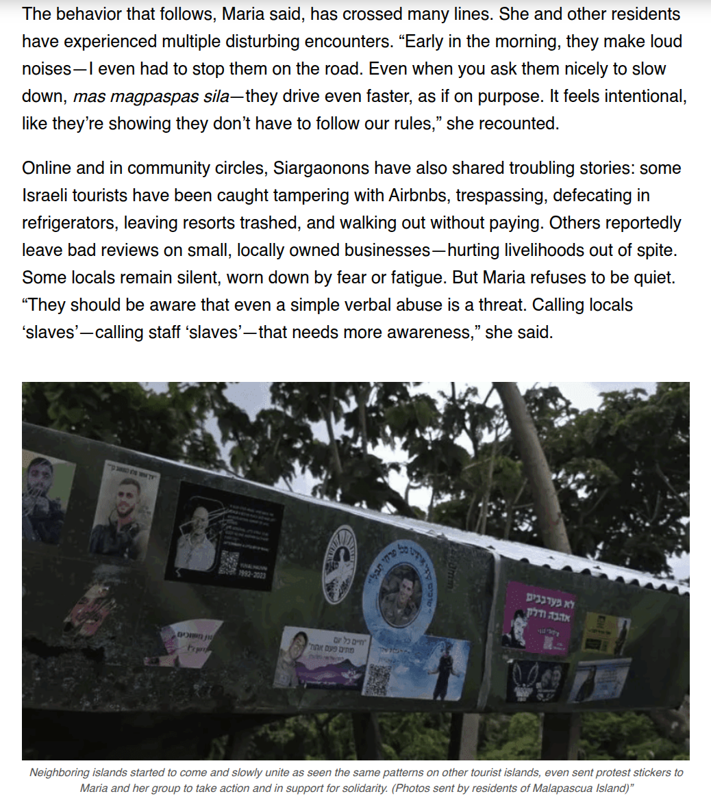 The behavior that follows, Maria said, has crossed many lines. She and other residents have experienced multiple disturbing encounters. “Early in the morning, they make loud noises—I even had to stop them on the road. Even when you ask them nicely to slow down, mas magpaspas sila—they drive even faster, as if on purpose. It feels intentional, like they're showing they don’t have to follow our rules,” she recounted. Online and in community circles, Siargaonons have also shared troubling stories: some Israeli tourists have been caught tampering with Airbnbs, trespassing, defecating in refrigerators, leaving resorts trashed, and walking out without paying. Others reportedly leave bad reviews on small, locally owned businesses —hurting livelihoods out of spite. Some locals remain silent, worn down by fear or fatigue. But Maria refuses to be quiet. “They should be aware that even a simple verbal abuse is a threat. Calling locals ‘slaves’—calling staff ‘slaves’—that needs more awareness,” she said. Neighboring islands started to come and slowly unite as seen the same patterns on other tourist islands, even sent protest stickers to Maria and her group to take action and in support for solidarity. (Photos sent by residents of Malapascua Island)”