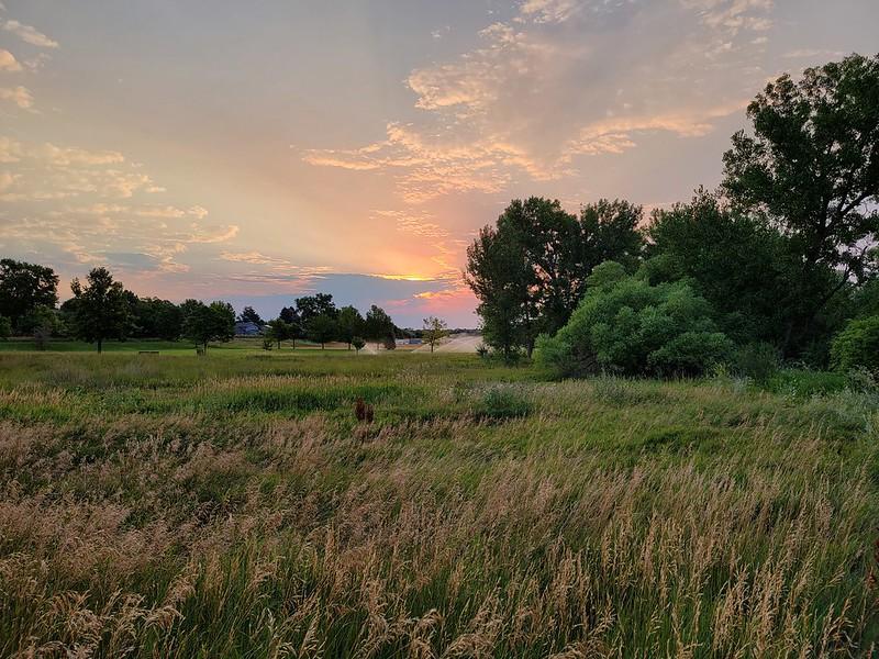The rising sun hides behind a band of clouds, making a sharp contrast between the bright rays of morning illuminating the sky and the subdued lighting across the park's trees and grasses. The sky with its clouds painted by the sun feels vast.