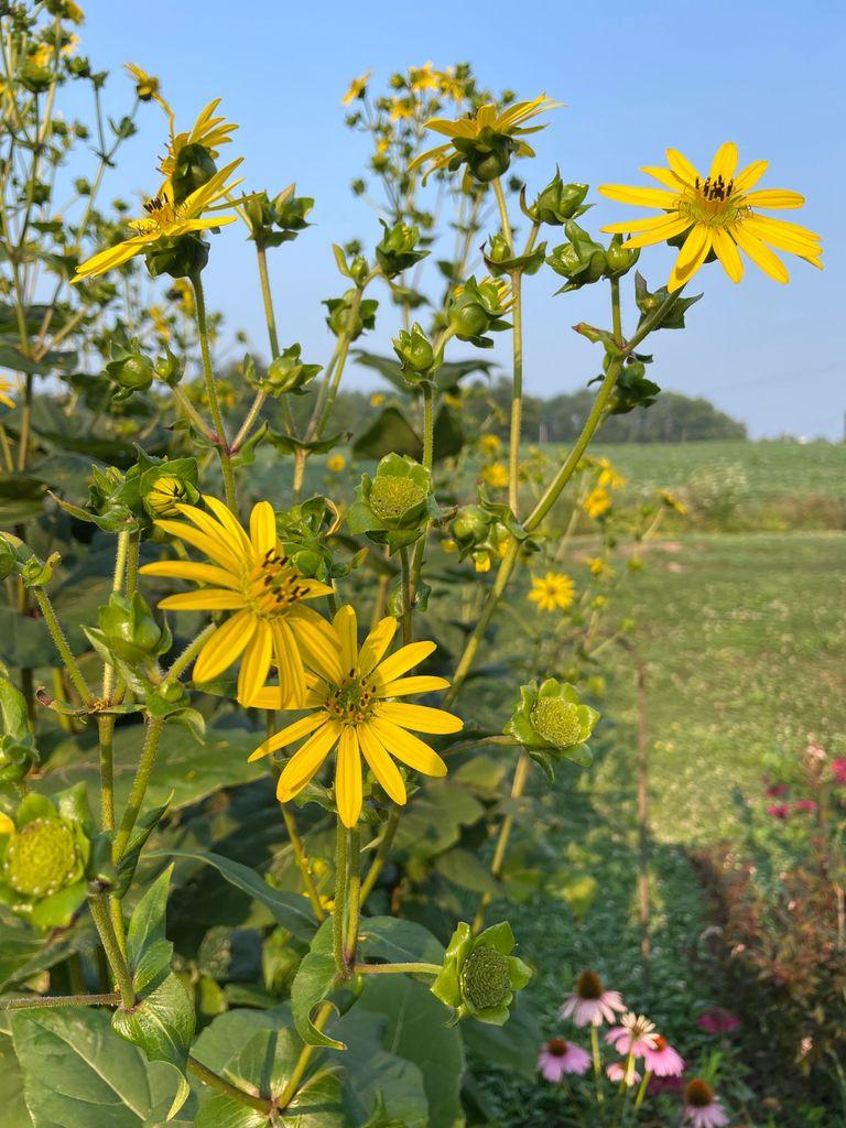 Tall, yellow flowers with a field in the background.