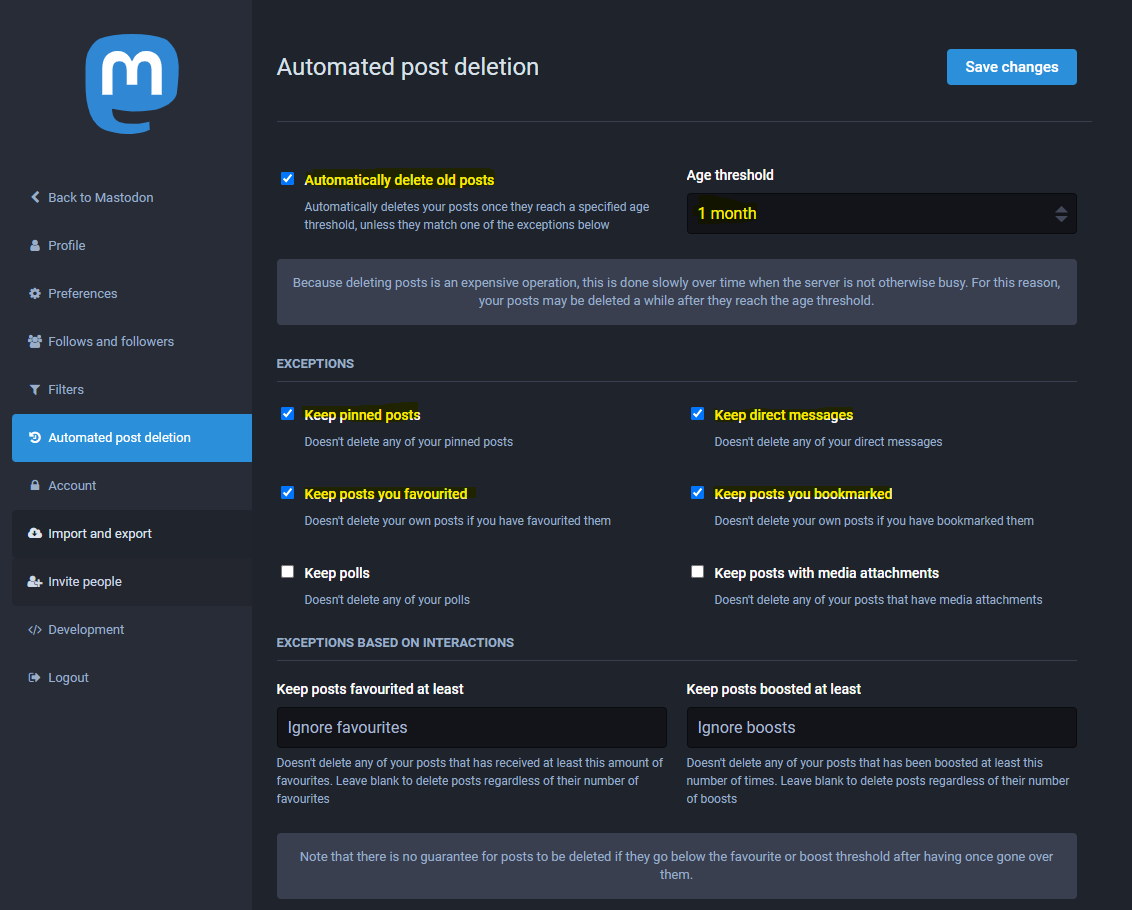Interfaccia Web di Mastodon. Sezione "Automated post deletion" in cui sono evidenziate alcune impostazioni per la cancellazione automatica e delle eccezioni per mantenere post. Tra le eccezioni in evidenza "Keep pinned post", "Keep post you bookmarked"