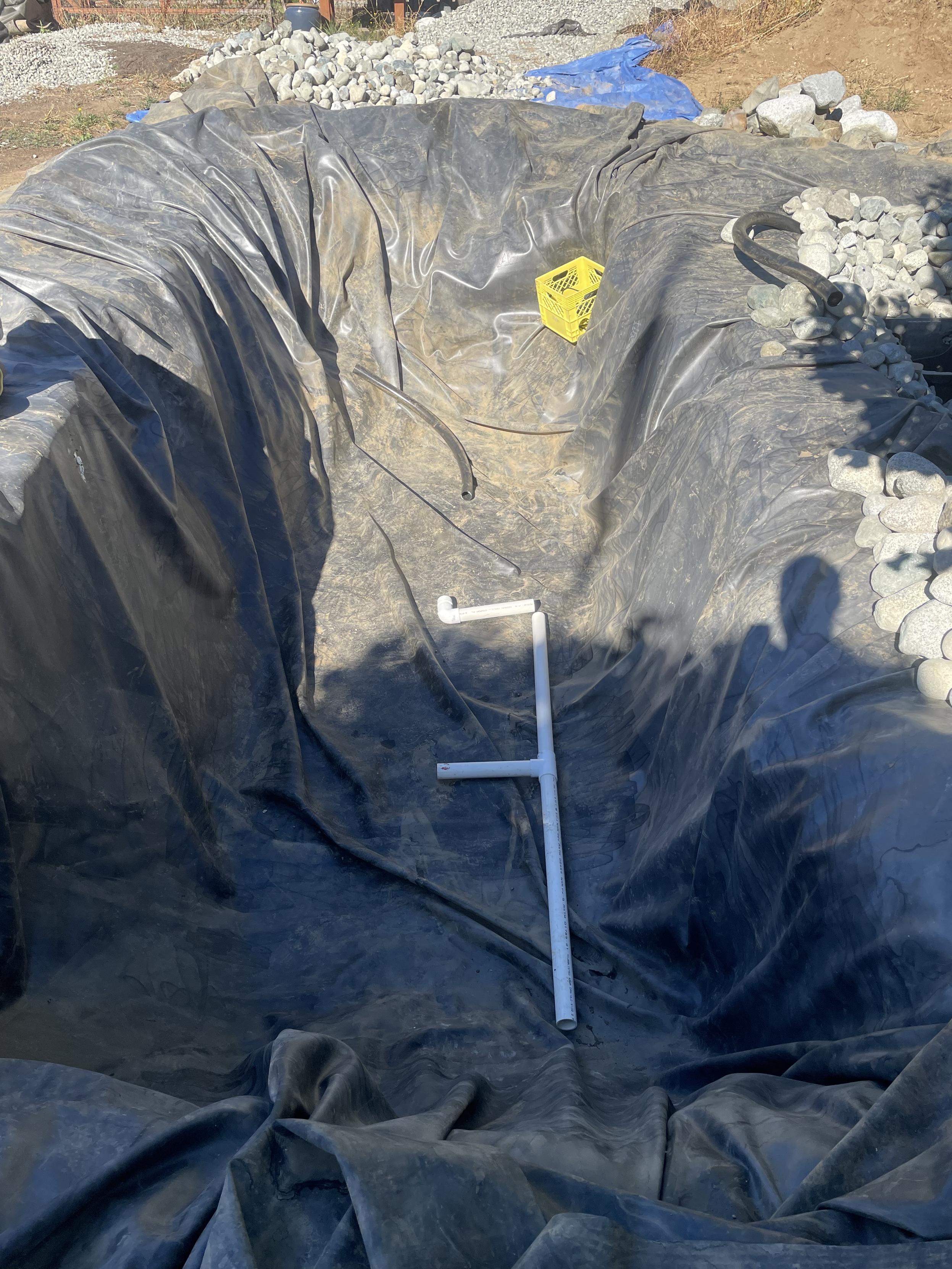 a picture of a sort of reverse E shape pvc pipe in the bottomof the runber lined pond.