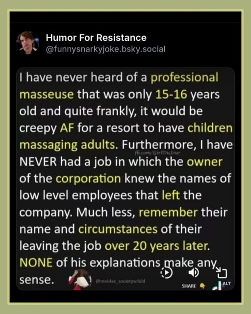 - Humor For Resistance @funnysnarkyjoke.bsky.social | have never heard of a professional masseuse that was only 15-16 years old and quite frankly, it would be creepy AF for a resort to have children massaging adults. Furthermore, | have NEVER had a job in which the owner of the corporation knew the names of low level employees that left the company. Much less, remember their name and circumstances of their leaving the job over 20 years later. NONE of his explanations make any sense.