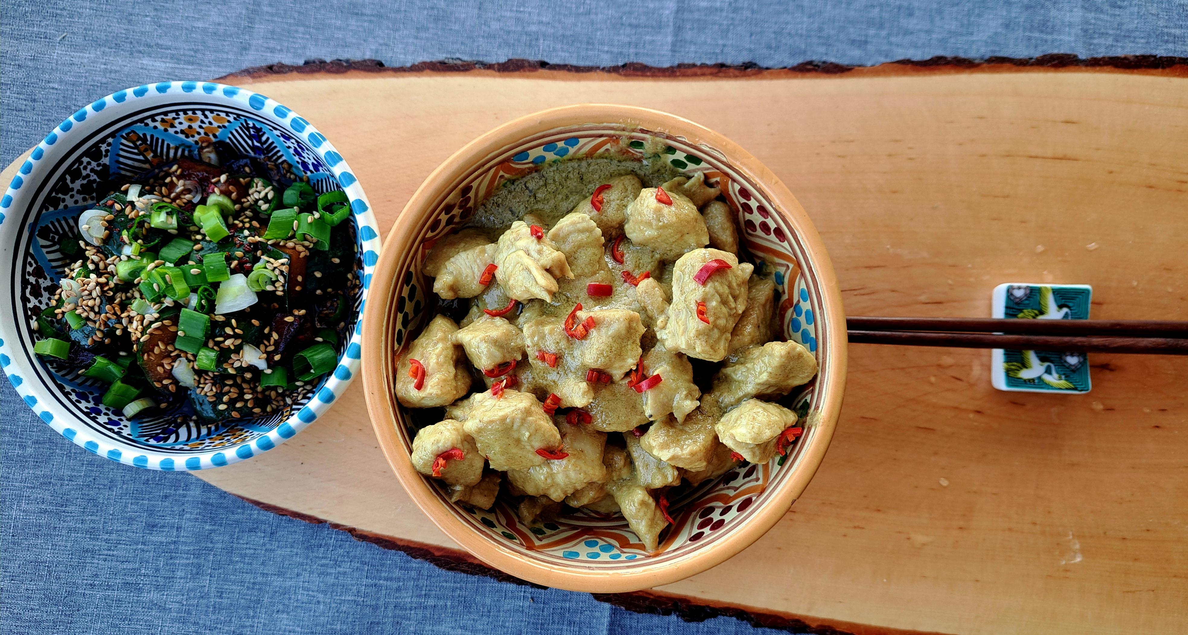 GrΓΌnes Thai Curry mit koreanischem Gurkensalat