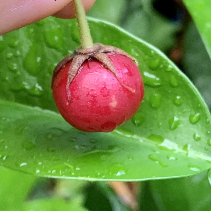 A very dark pink to red Jamaican cherry being held over a very green citrus leaf (red pomelo). Both the berry and citrus leaf are covered in water droplets bc it was raining.