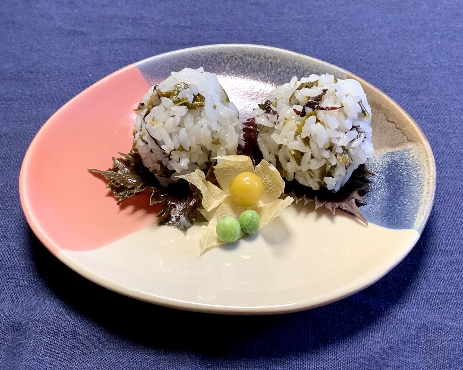 On a blue cloth is a irregular circular shape that is pie-graph colored from pink, navy, grey, lรกpiz and cream. On top of the plate are two onigiri balls that are rolled with sweet pickled strips of young jackfruit leaves with a little bit of shiso. They are on red and green shiso leaves. In front of them is a wild physallis opened from its paper casing like a yellow pearl and two tiny round green wild cucumbers.