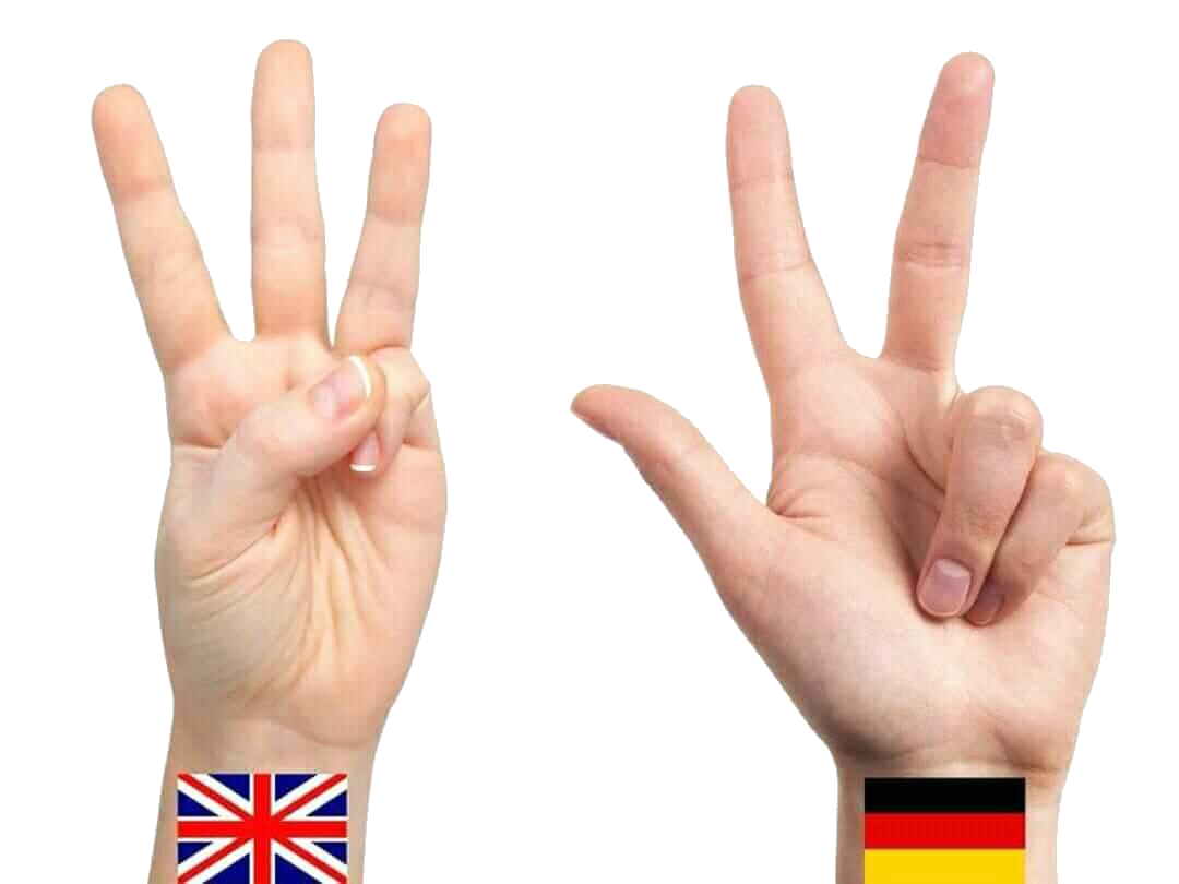 Hand signs for three showing the English style with the pointer, index, and ring fingers out and the German style with the thumb, pointer, and index fingers out.