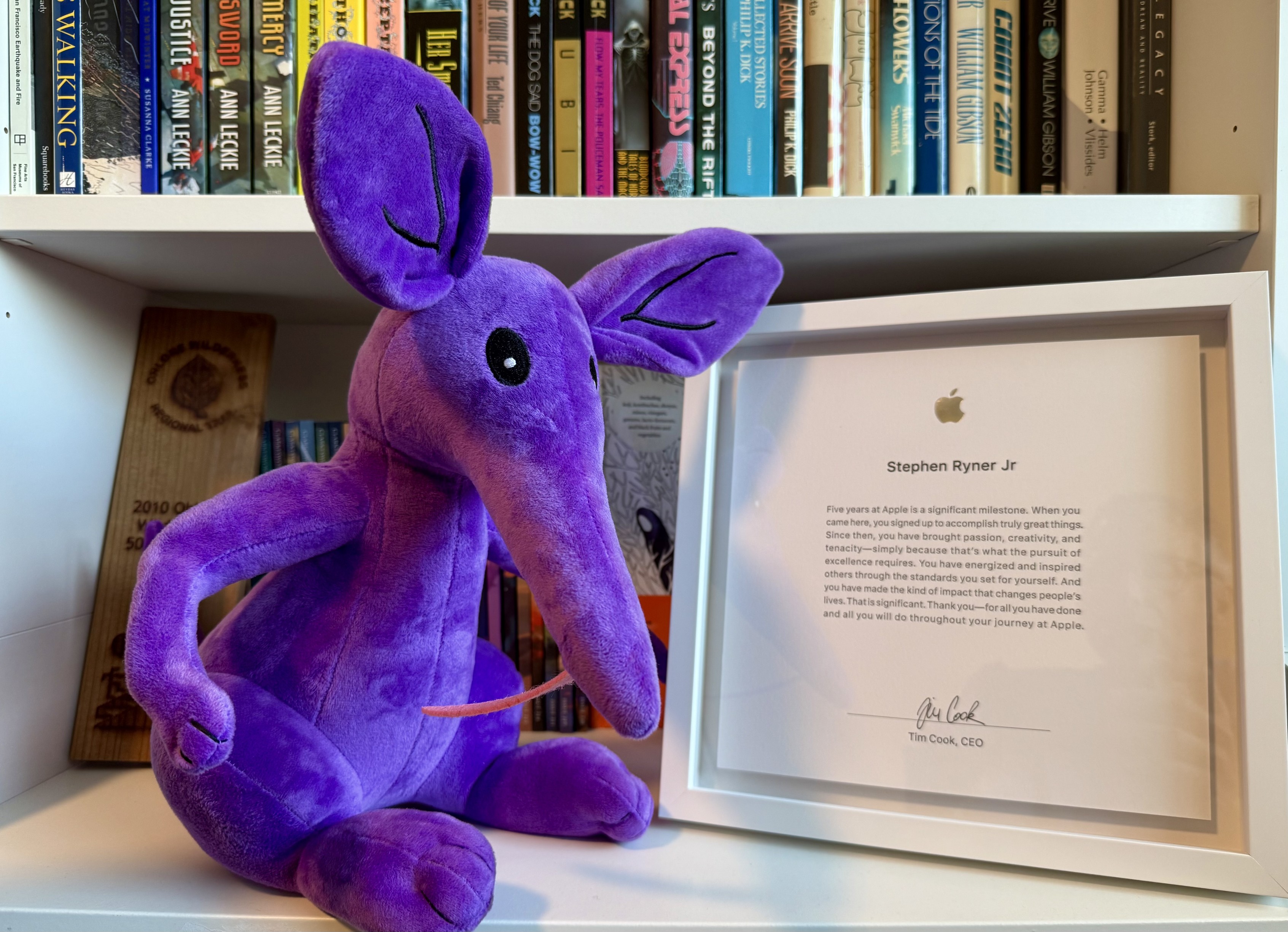 Photograph of an Apple five year anniversary plaque. A purple aardvark plushie sits beside the plaque. Anika is the unofficial mascot of Radar, the system Apple uses for tracking features and issues.