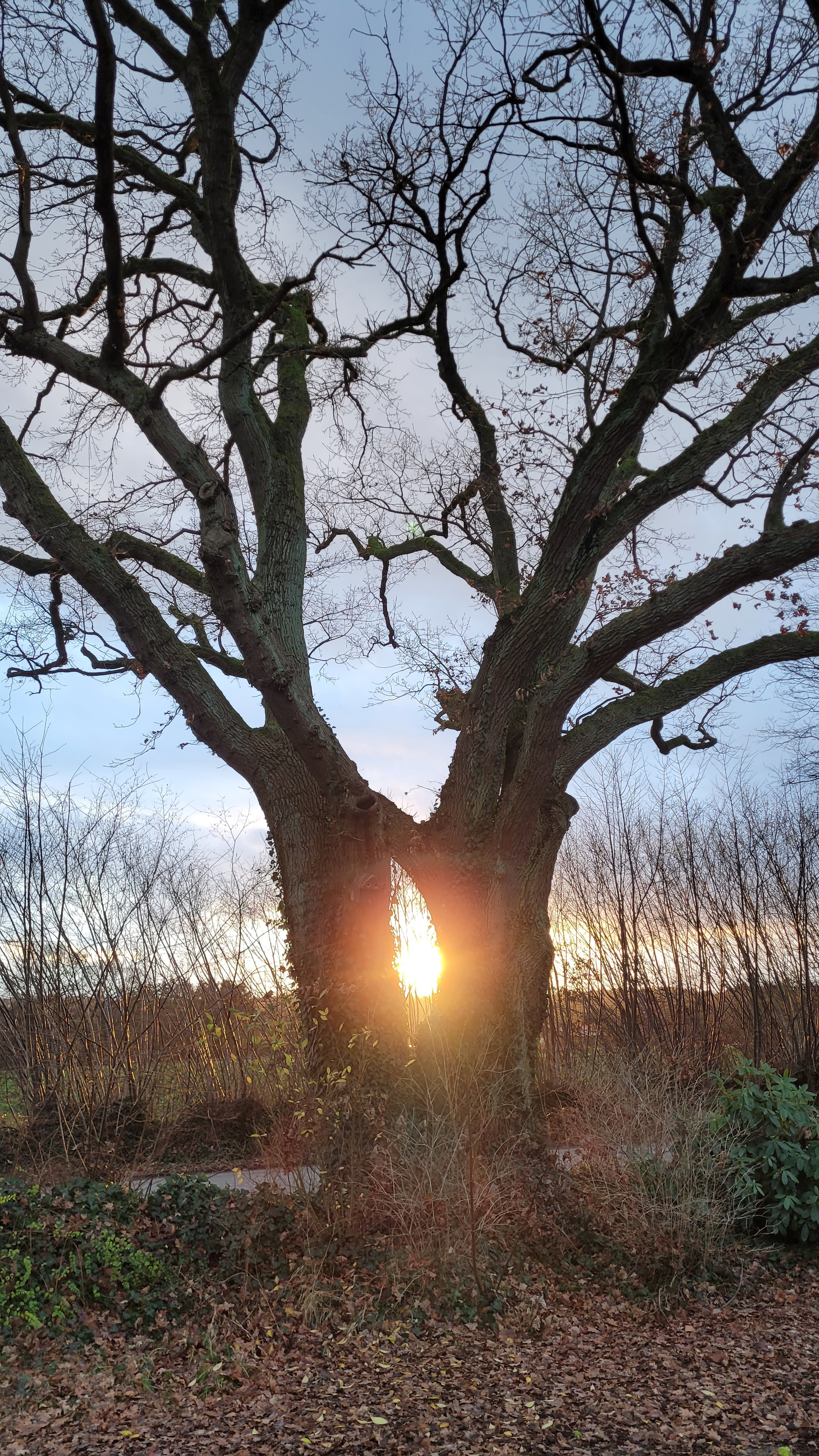 Eine doppelstämmige Eiche steht am Wegesrand, die untergehende Dezembersonne scheint durch die Lücke zwischen den Stämmen.